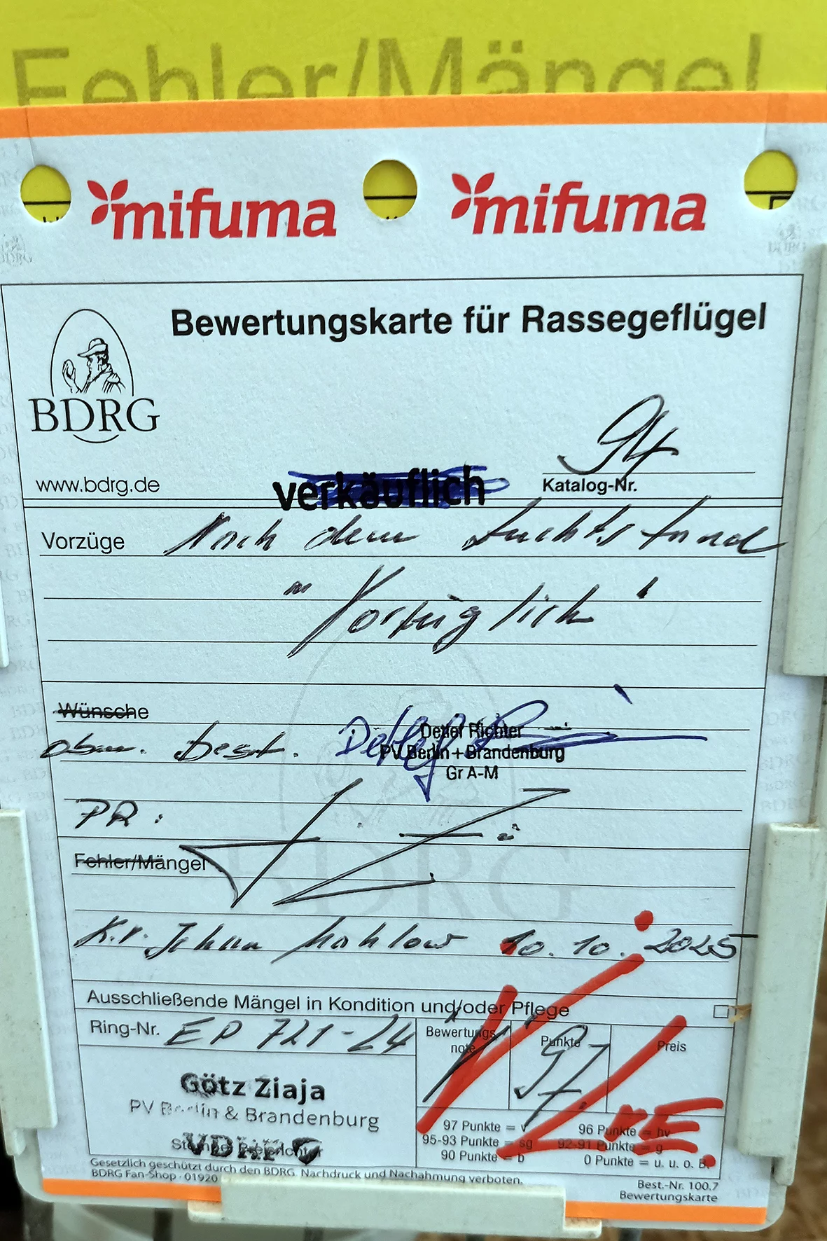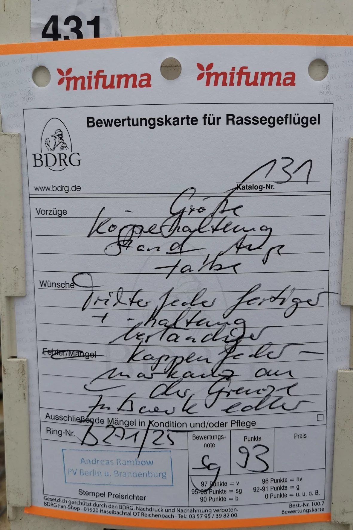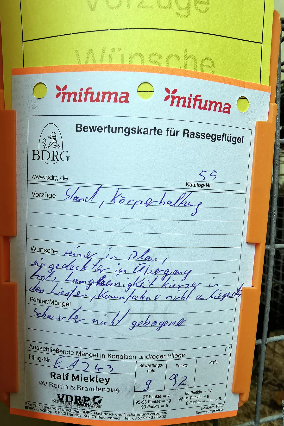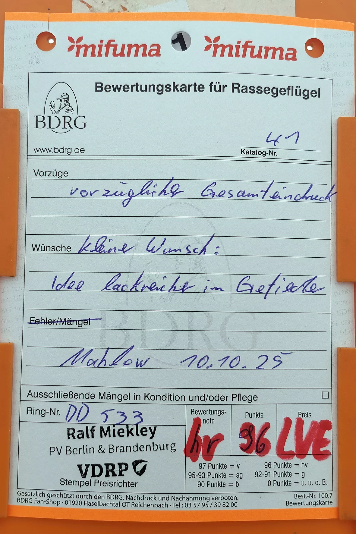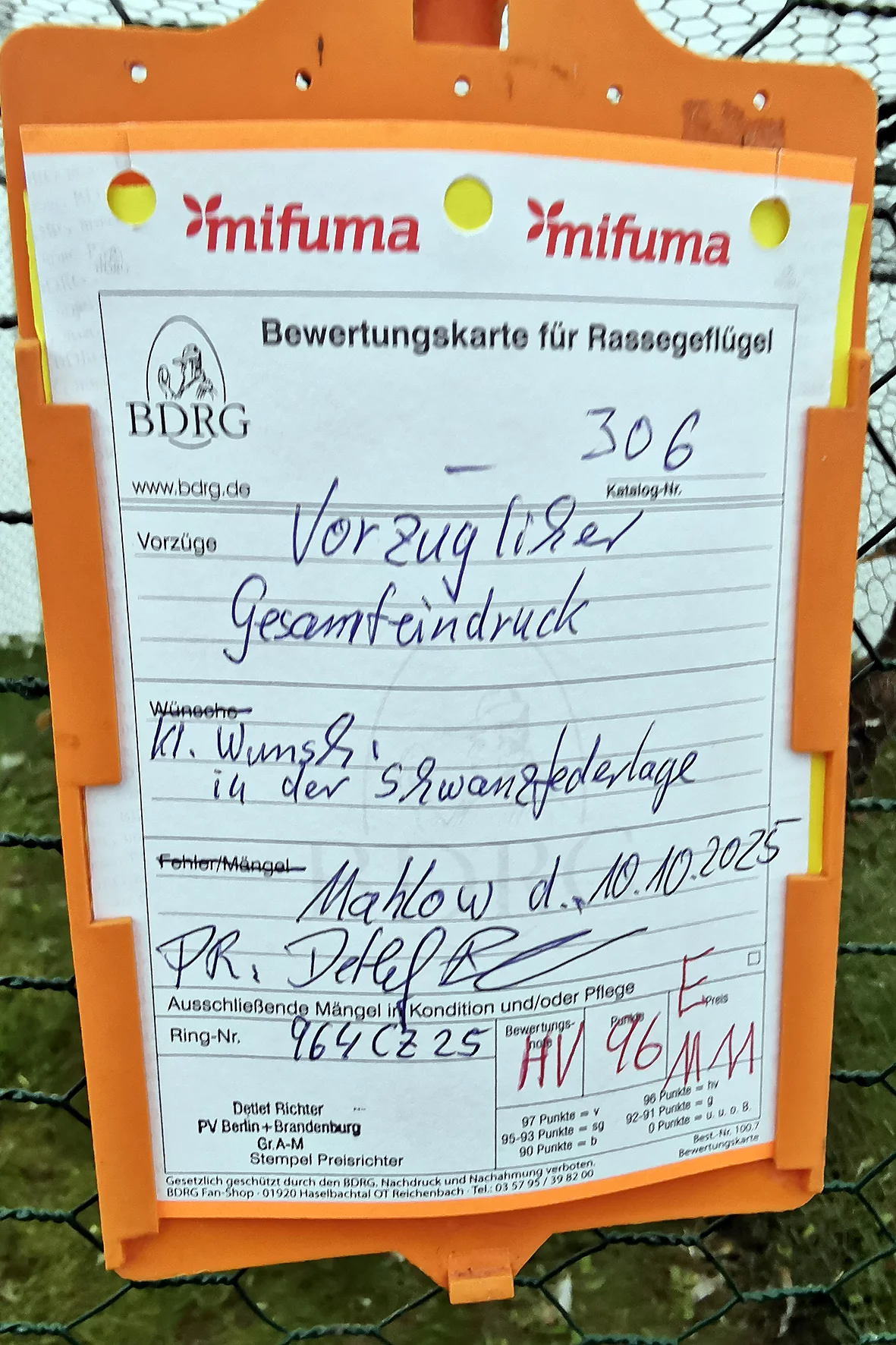 Besonders auffällig waren die Brahmas eines jungen Züchters, die in den Farbenschlägen Blau und Schwarz vorgestellt wurden. Diese Tiere zeigten bereits eine sehr ansprechende Entwicklung. Meiner Ansicht nach wären hier jeweils ein Punkte mehr in der Bewertung gerechtfertigt gewesen. Der Mahlower Meistertitel wurde in diesem Jahr verdientermaßen an eine Henne in Blau dieses Jungzüchters vergeben – ein Tier, das sowohl im Typ, im Stand und auch in der Federstruktur zu überzeugen wusste. Ebenso hervorzuheben ist ein Vorwerkhahn, der mit der Note HV 96 ausgezeichnet wurde. Ein wirklich gelungenes Exemplar seiner Rasse, das nicht nur durch seine Erscheinung, sondern auch durch seine ruhige Art beeindruckte.