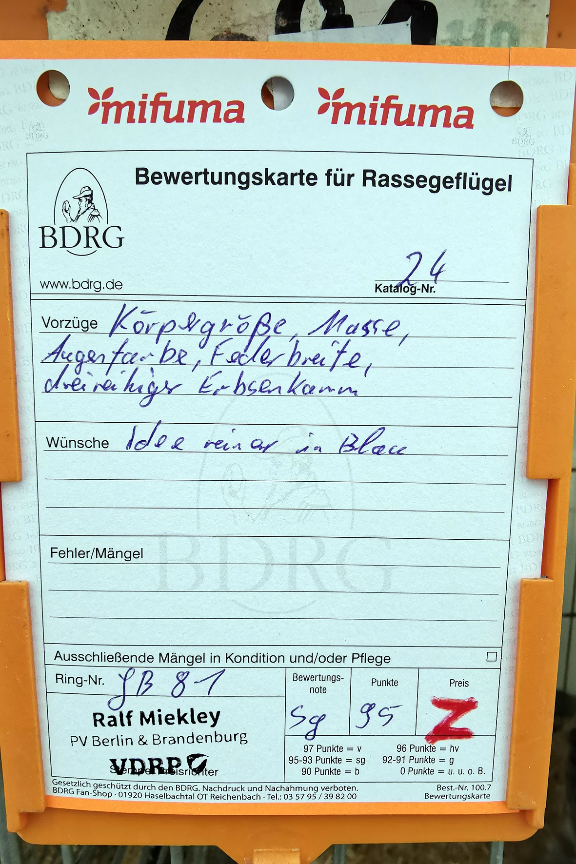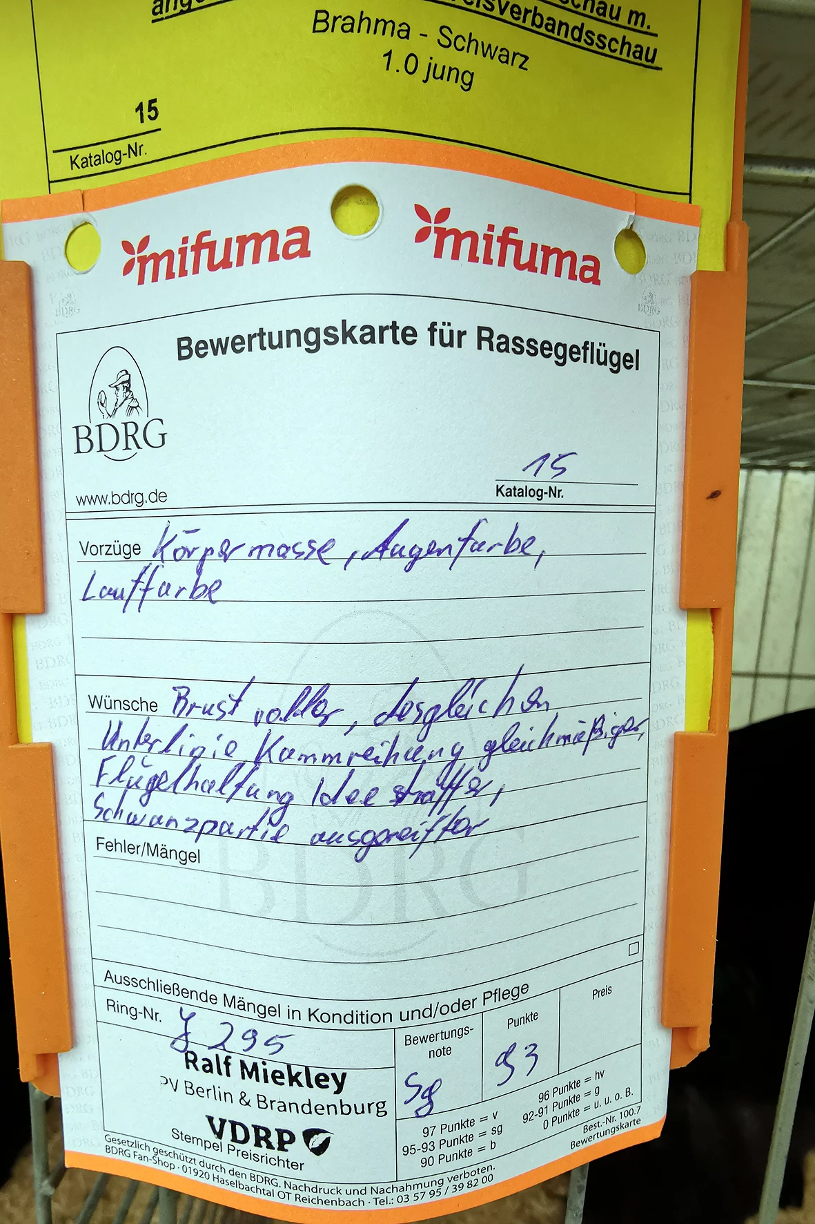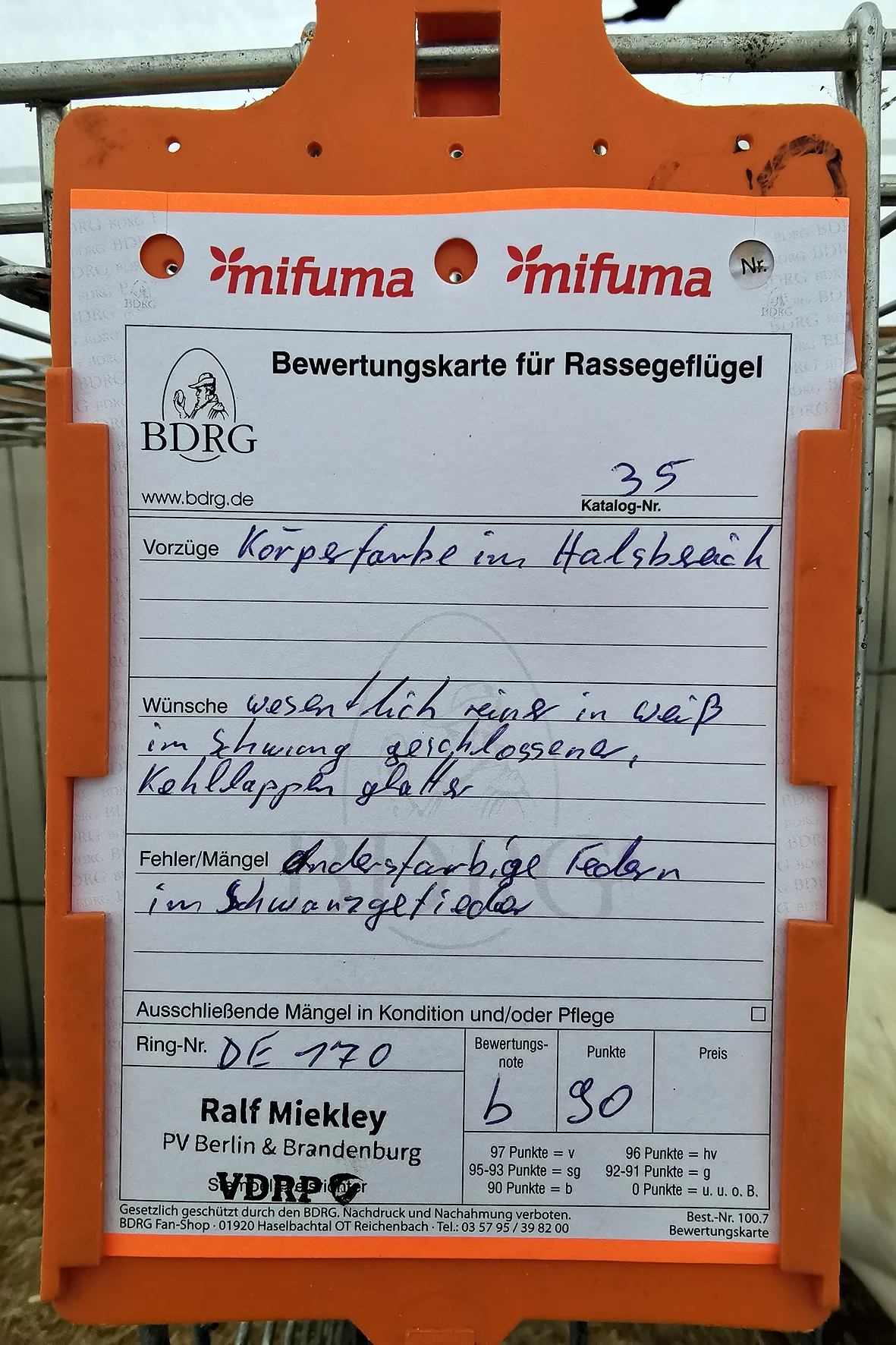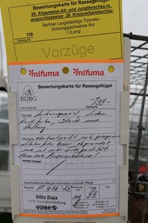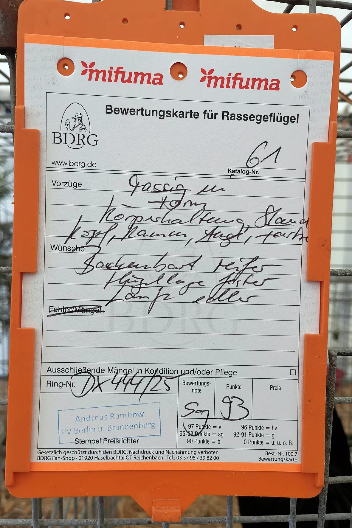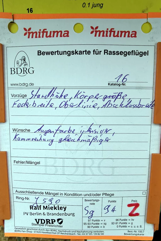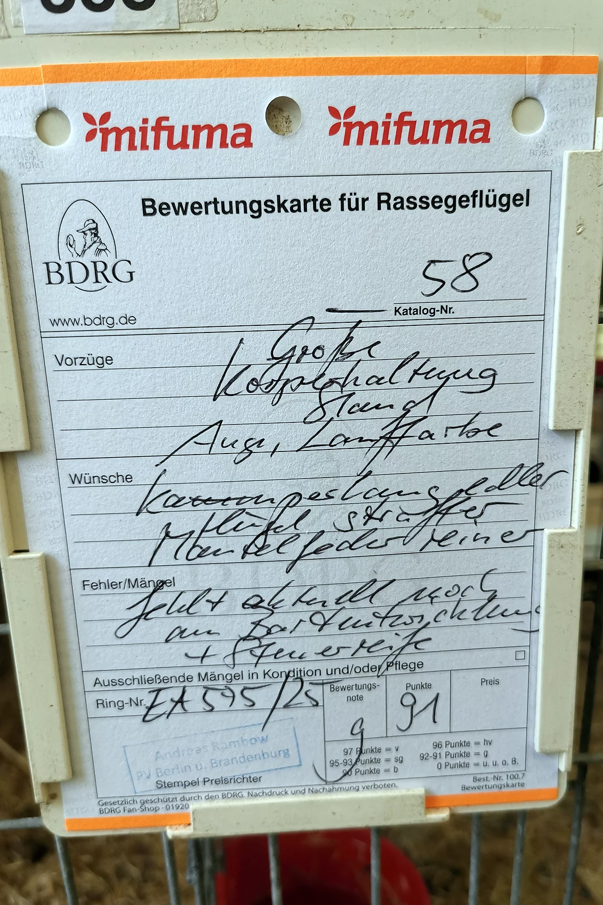 Besonders auffällig waren die Brahmas eines jungen Züchters, die in den Farbenschlägen Blau und Schwarz vorgestellt wurden. Diese Tiere zeigten bereits eine sehr ansprechende Entwicklung. Meiner Ansicht nach wären hier jeweils ein Punkte mehr in der Bewertung gerechtfertigt gewesen. Der Mahlower Meistertitel wurde in diesem Jahr verdientermaßen an eine Henne in Blau dieses Jungzüchters vergeben – ein Tier, das sowohl im Typ, im Stand und auch in der Federstruktur zu überzeugen wusste. Ebenso hervorzuheben ist ein Vorwerkhahn, der mit der Note HV 96 ausgezeichnet wurde. Ein wirklich gelungenes Exemplar seiner Rasse, das nicht nur durch seine Erscheinung, sondern auch durch seine ruhige Art beeindruckte.