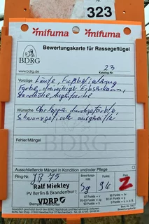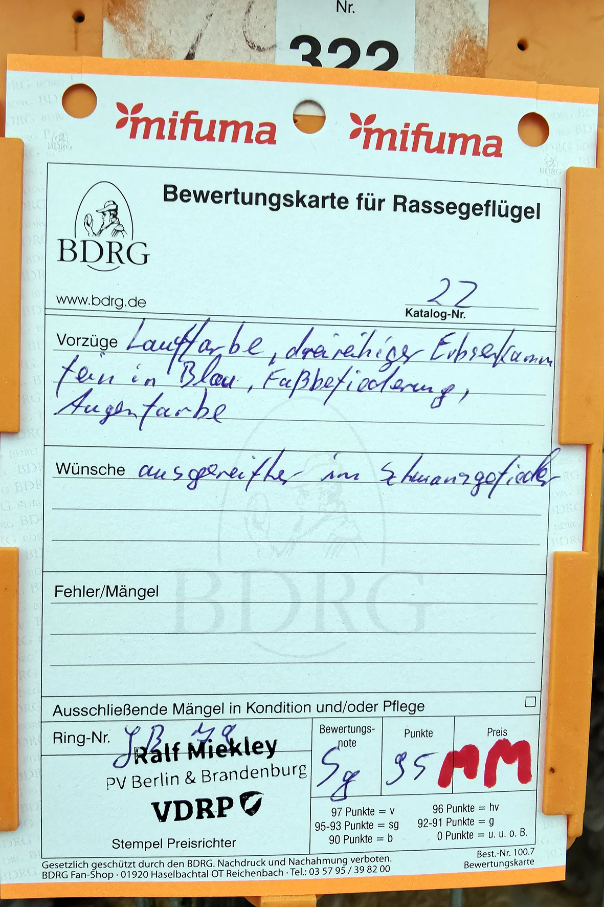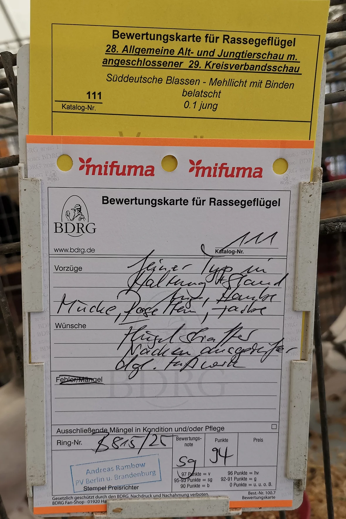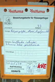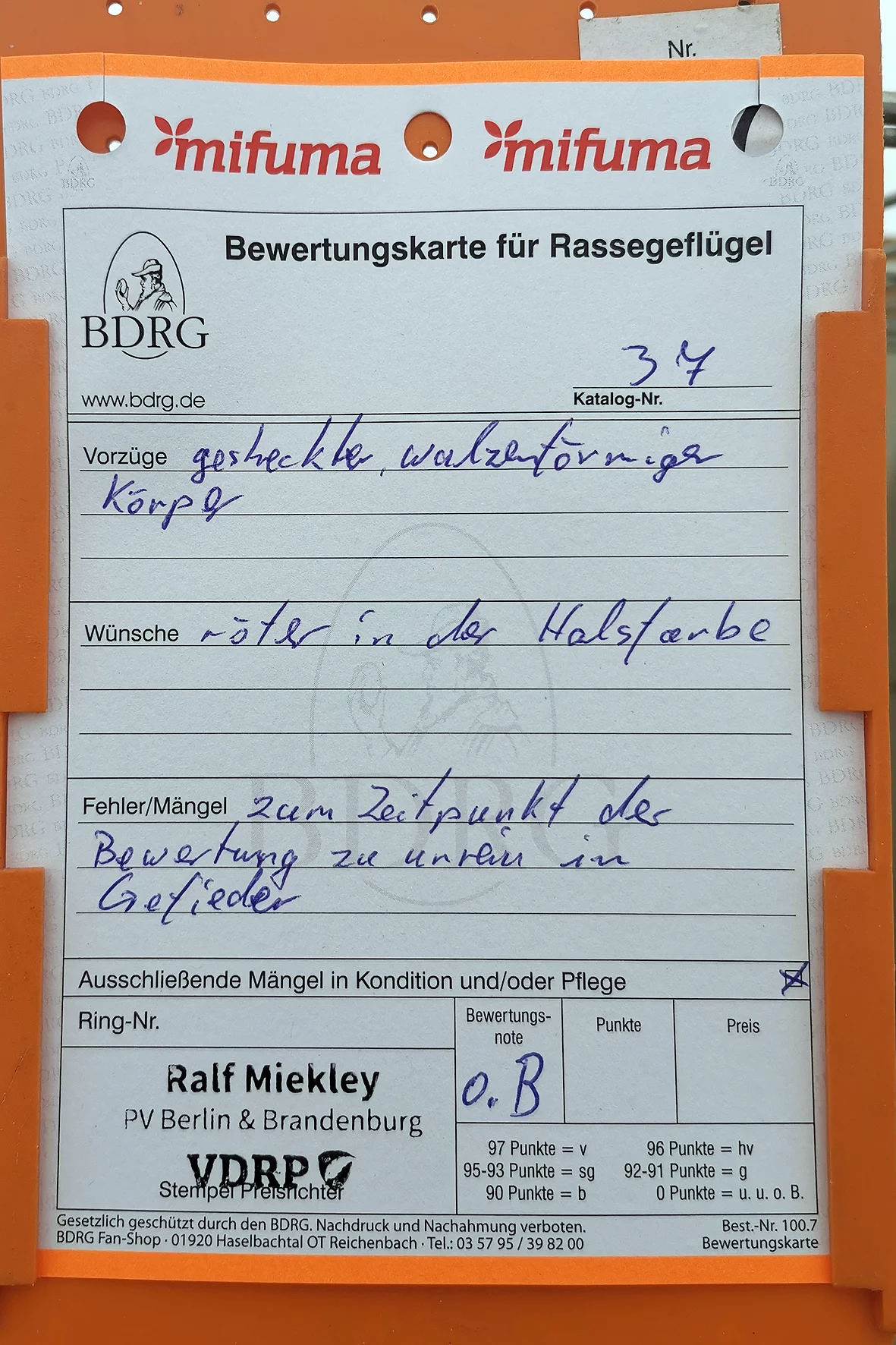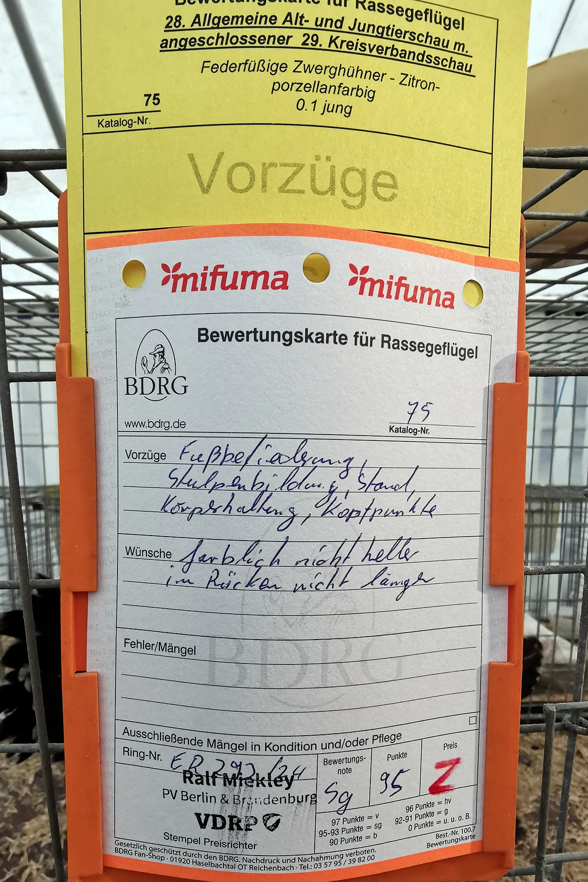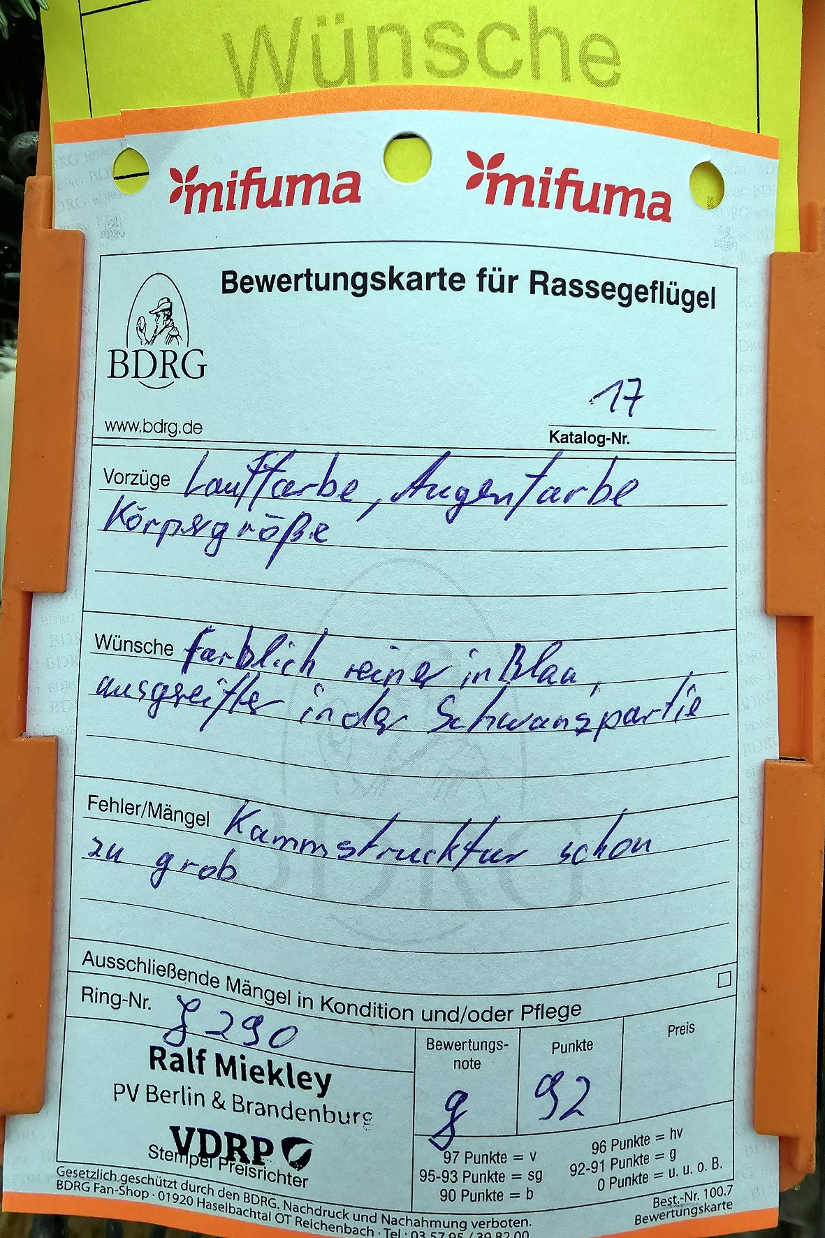 Besonders auffällig waren die Brahmas eines jungen Züchters, die in den Farbenschlägen Blau und Schwarz vorgestellt wurden. Diese Tiere zeigten bereits eine sehr ansprechende Entwicklung. Meiner Ansicht nach wären hier jeweils ein Punkte mehr in der Bewertung gerechtfertigt gewesen. Der Mahlower Meistertitel wurde in diesem Jahr verdientermaßen an eine Henne in Blau dieses Jungzüchters vergeben – ein Tier, das sowohl im Typ, im Stand und auch in der Federstruktur zu überzeugen wusste. Ebenso hervorzuheben ist ein Vorwerkhahn, der mit der Note HV 96 ausgezeichnet wurde. Ein wirklich gelungenes Exemplar seiner Rasse, das nicht nur durch seine Erscheinung, sondern auch durch seine ruhige Art beeindruckte.