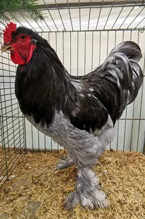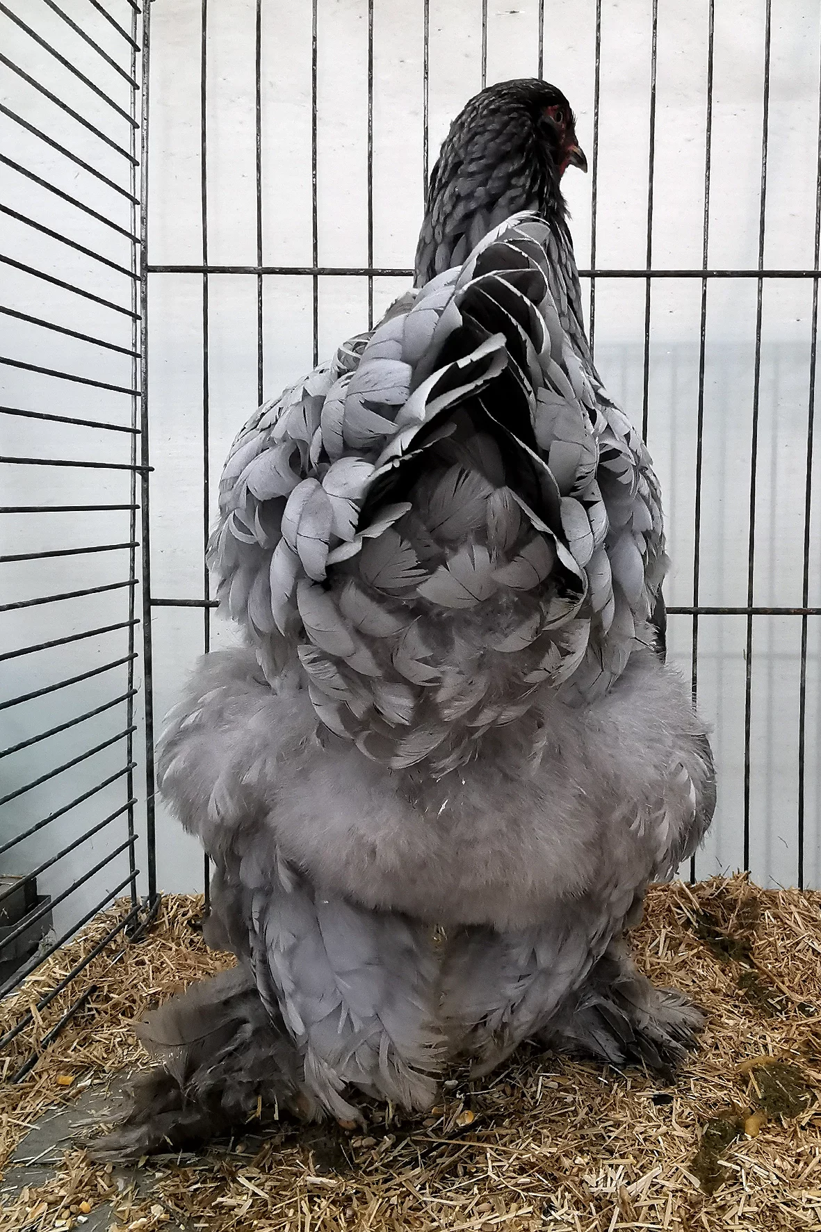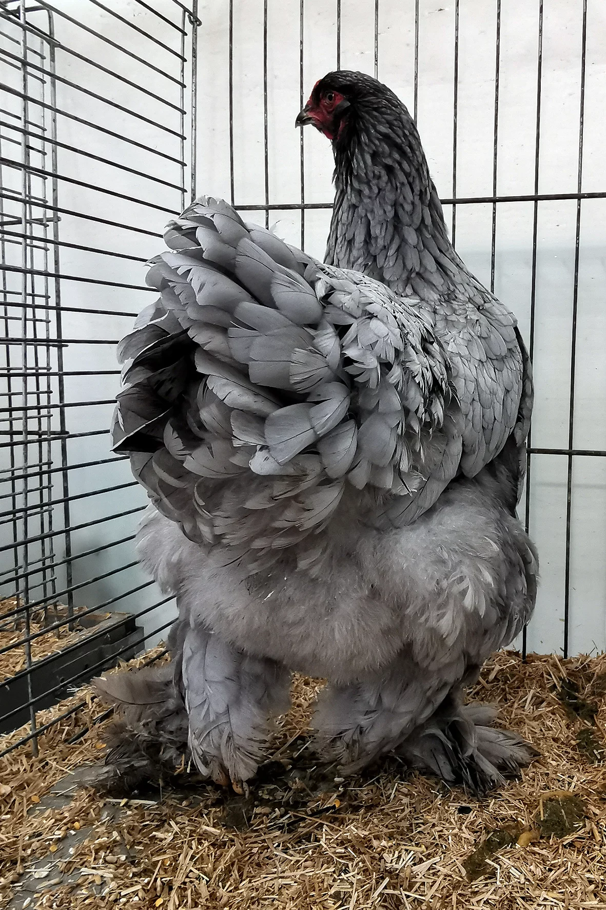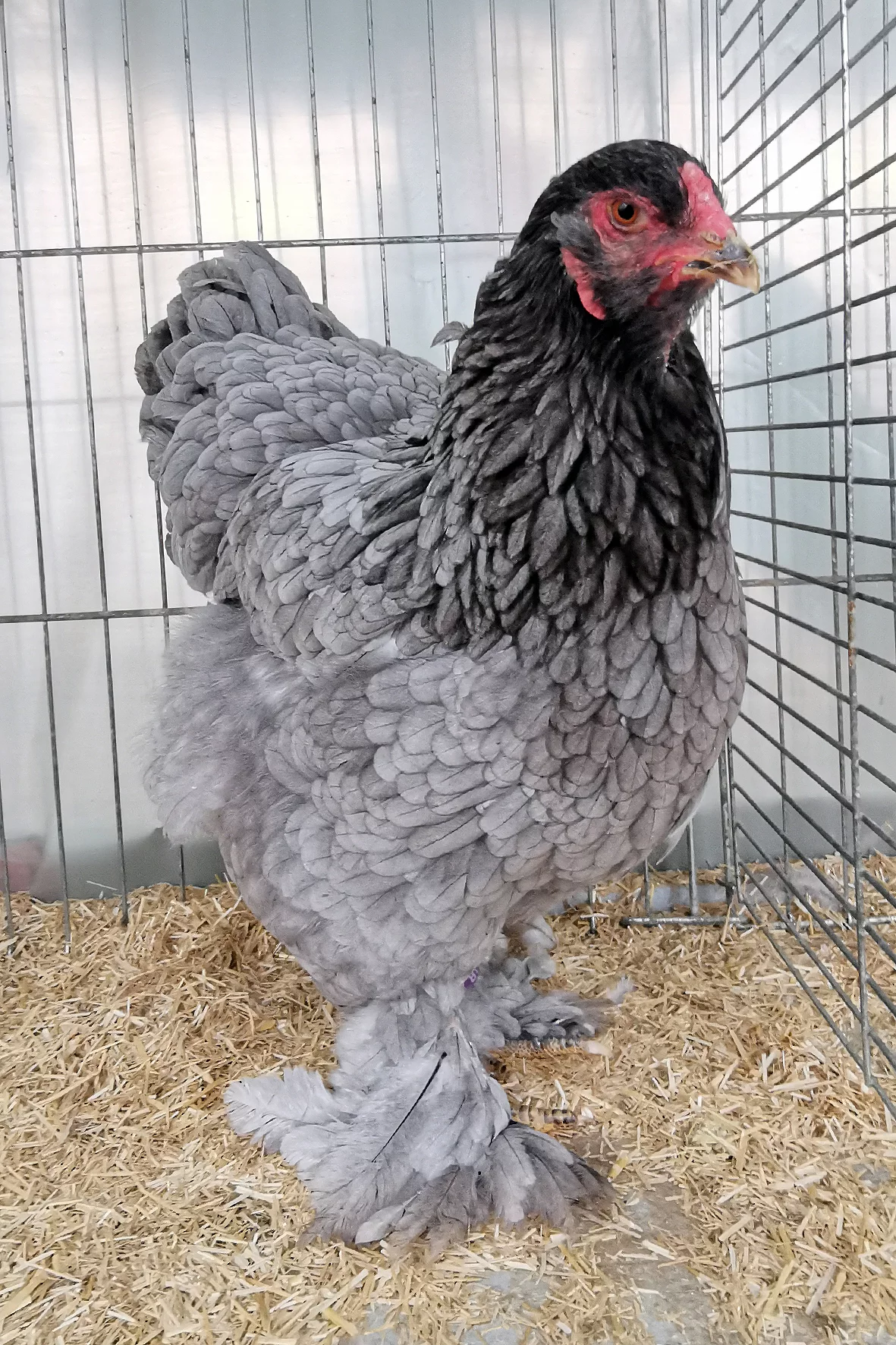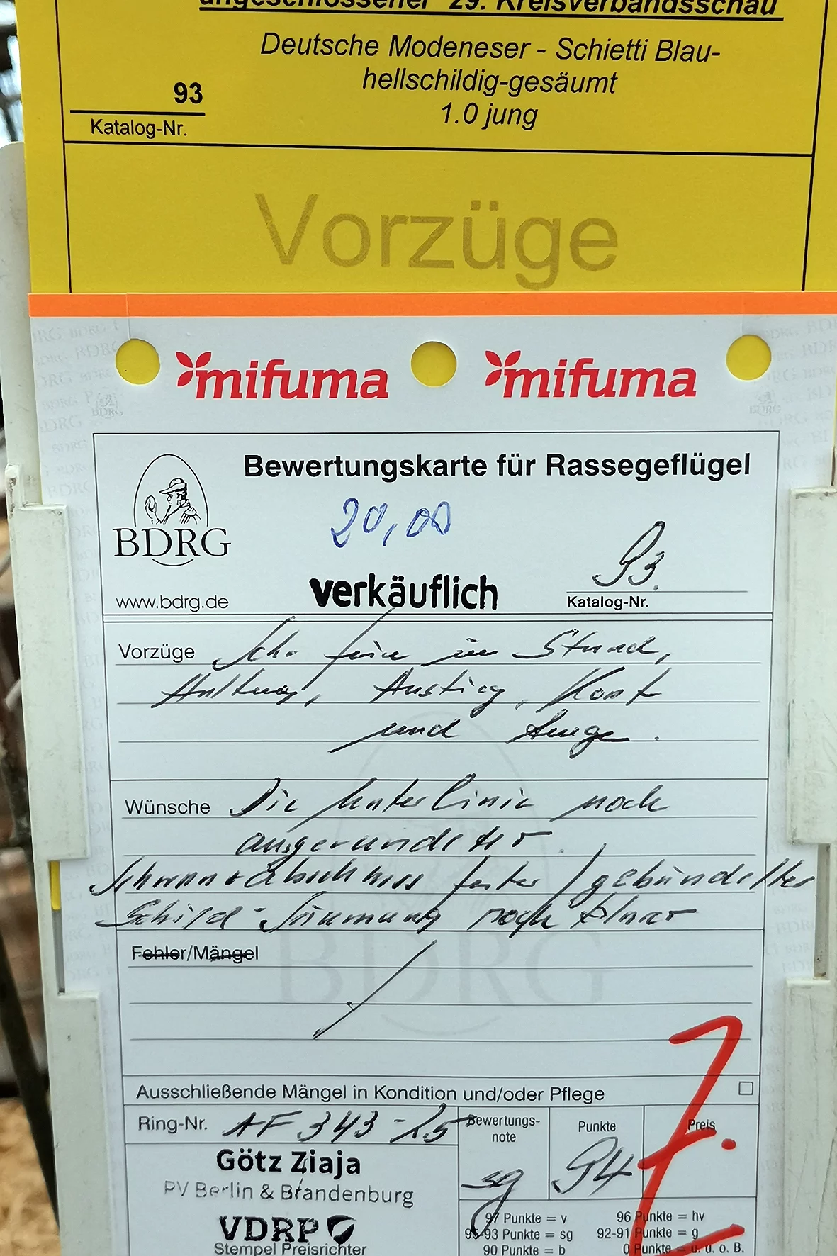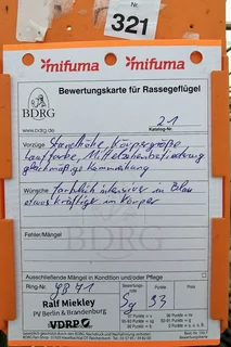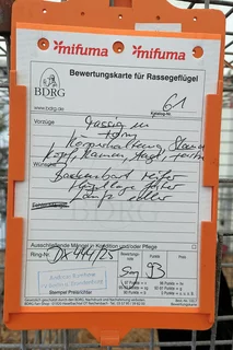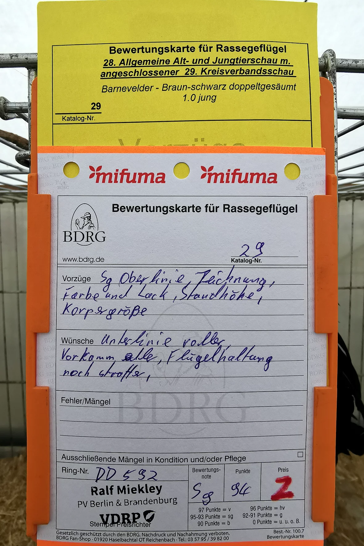 Besonders auffällig waren die Brahmas eines jungen Züchters, die in den Farbenschlägen Blau und Schwarz vorgestellt wurden. Diese Tiere zeigten bereits eine sehr ansprechende Entwicklung. Meiner Ansicht nach wären hier jeweils ein Punkte mehr in der Bewertung gerechtfertigt gewesen. Der Mahlower Meistertitel wurde in diesem Jahr verdientermaßen an eine Henne in Blau dieses Jungzüchters vergeben – ein Tier, das sowohl im Typ, im Stand und auch in der Federstruktur zu überzeugen wusste. Ebenso hervorzuheben ist ein Vorwerkhahn, der mit der Note HV 96 ausgezeichnet wurde. Ein wirklich gelungenes Exemplar seiner Rasse, das nicht nur durch seine Erscheinung, sondern auch durch seine ruhige Art beeindruckte.