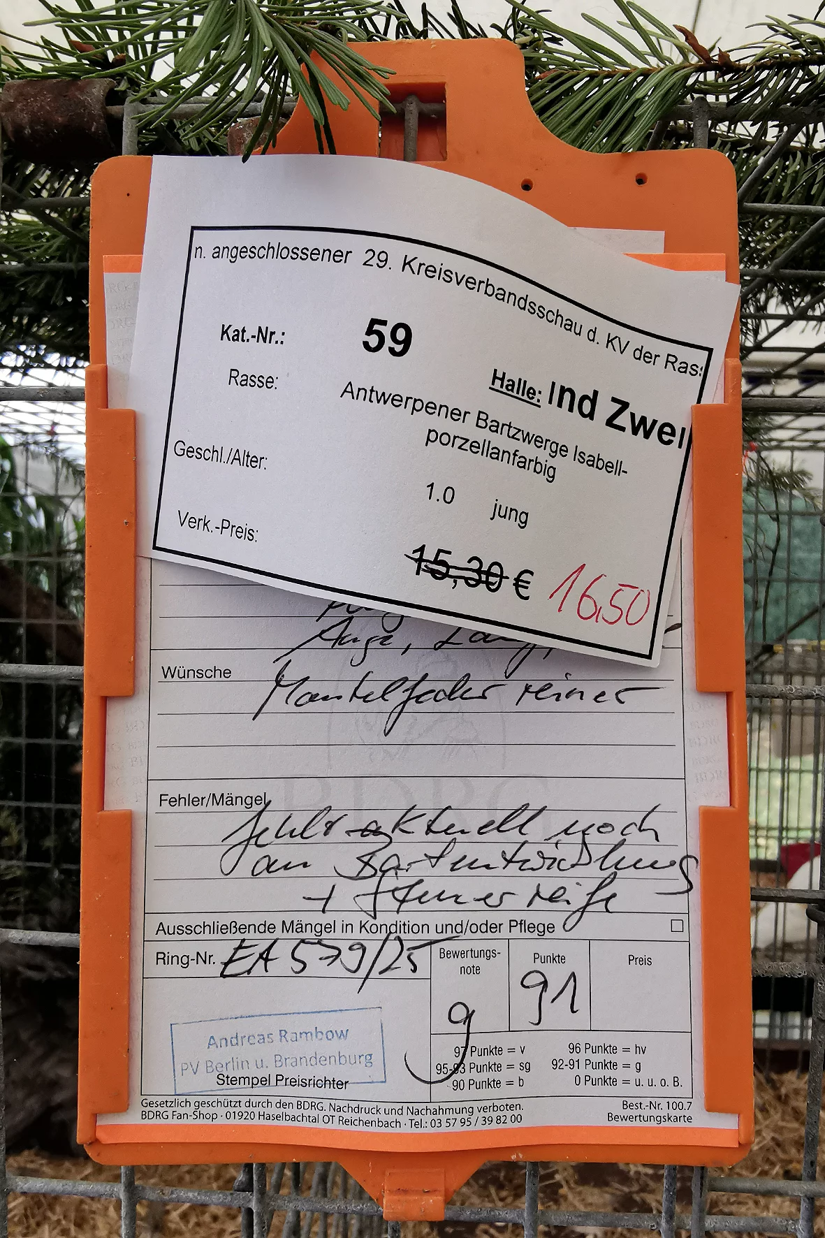 Die Absage der Erfurter Ausstellung war auch hier ein zentrales Thema. Die Unsicherheit und der Unmut darüber waren spürbar. Ich schließe mich der Einschätzung von Jonas Gebert, Kreiszuchtwart des Kreisverbandes Berlin und Umgebung, an: In Zeiten solcher Entwicklungen gewinnen kleinere, regionale Schauen zunehmend an Bedeutung. Sie bieten nicht nur eine Möglichkeit, Tiere fachgerecht bewerten zu lassen, sondern fördern auch den direkten Austausch unter Züchtern und erhalten so die Gemeinschaft und die Qualität innerhalb der Zucht.