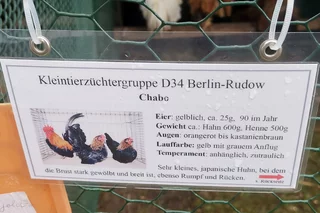 Etwas enttäuschend war, dass keine großen Hühnerrassen vertreten waren – erneut verhinderten behördliche Auflagen des Veterinäramts eine größere Vielfalt. Sehr schade, denn gerade diese Rassen hätten das Bild abgerundet.