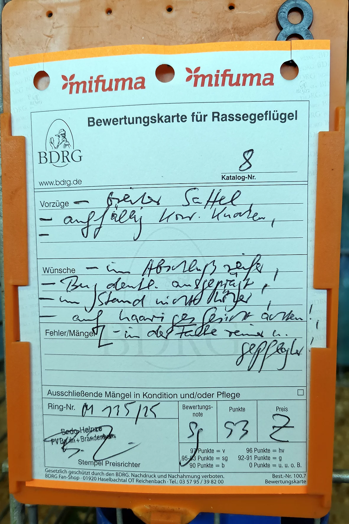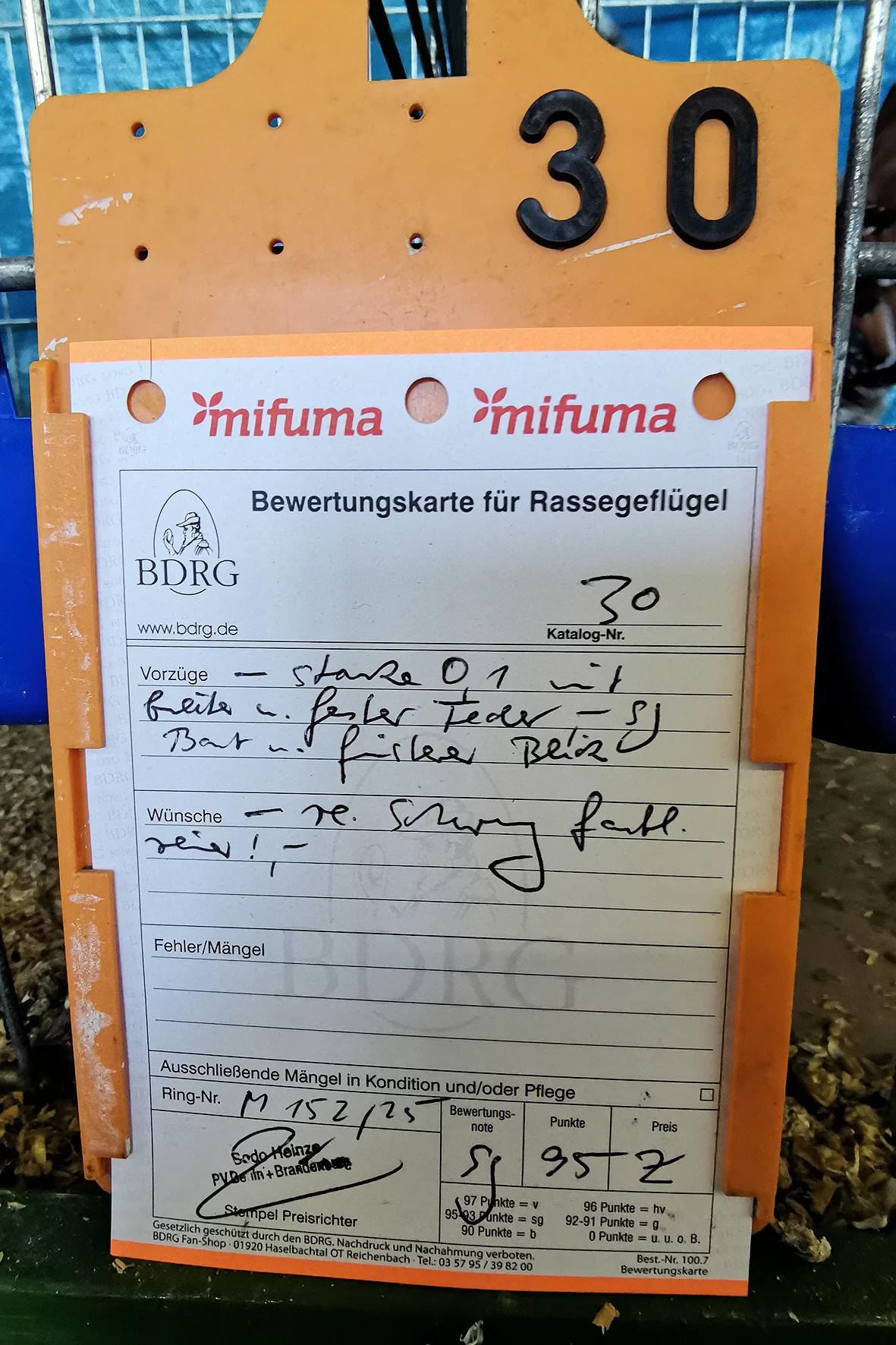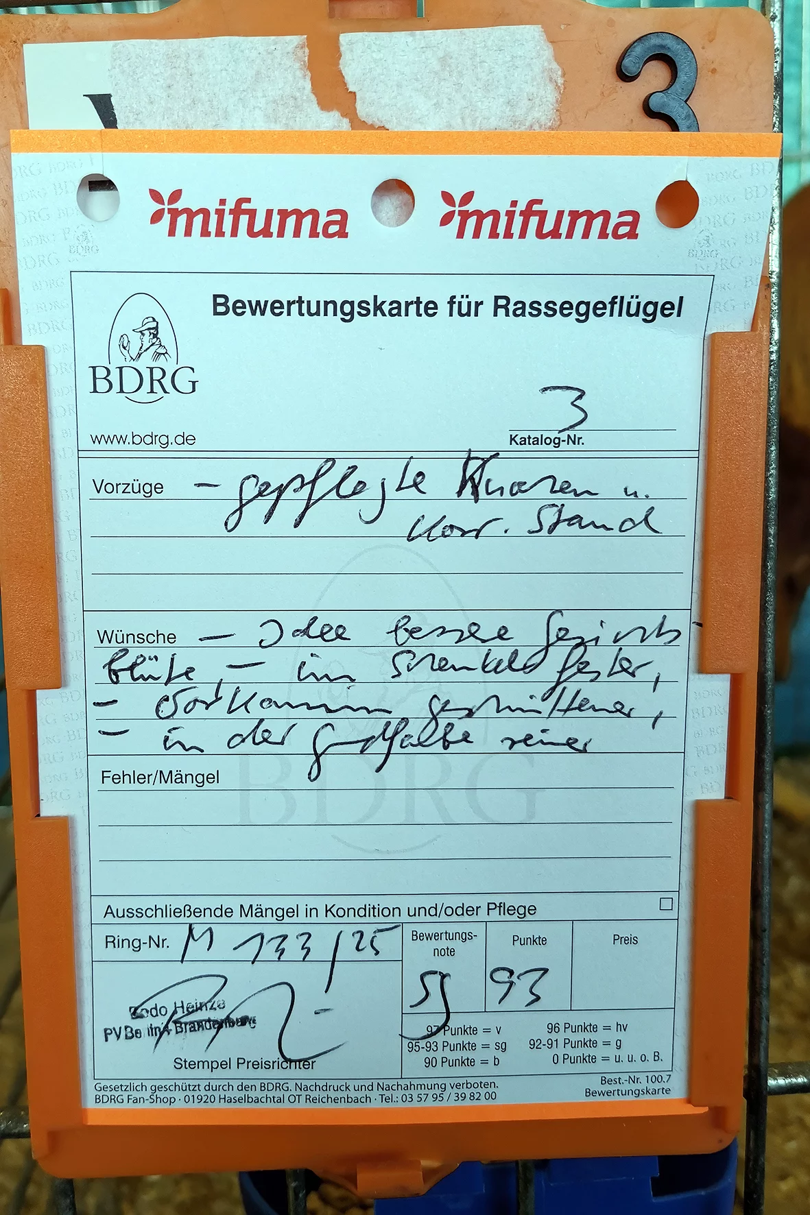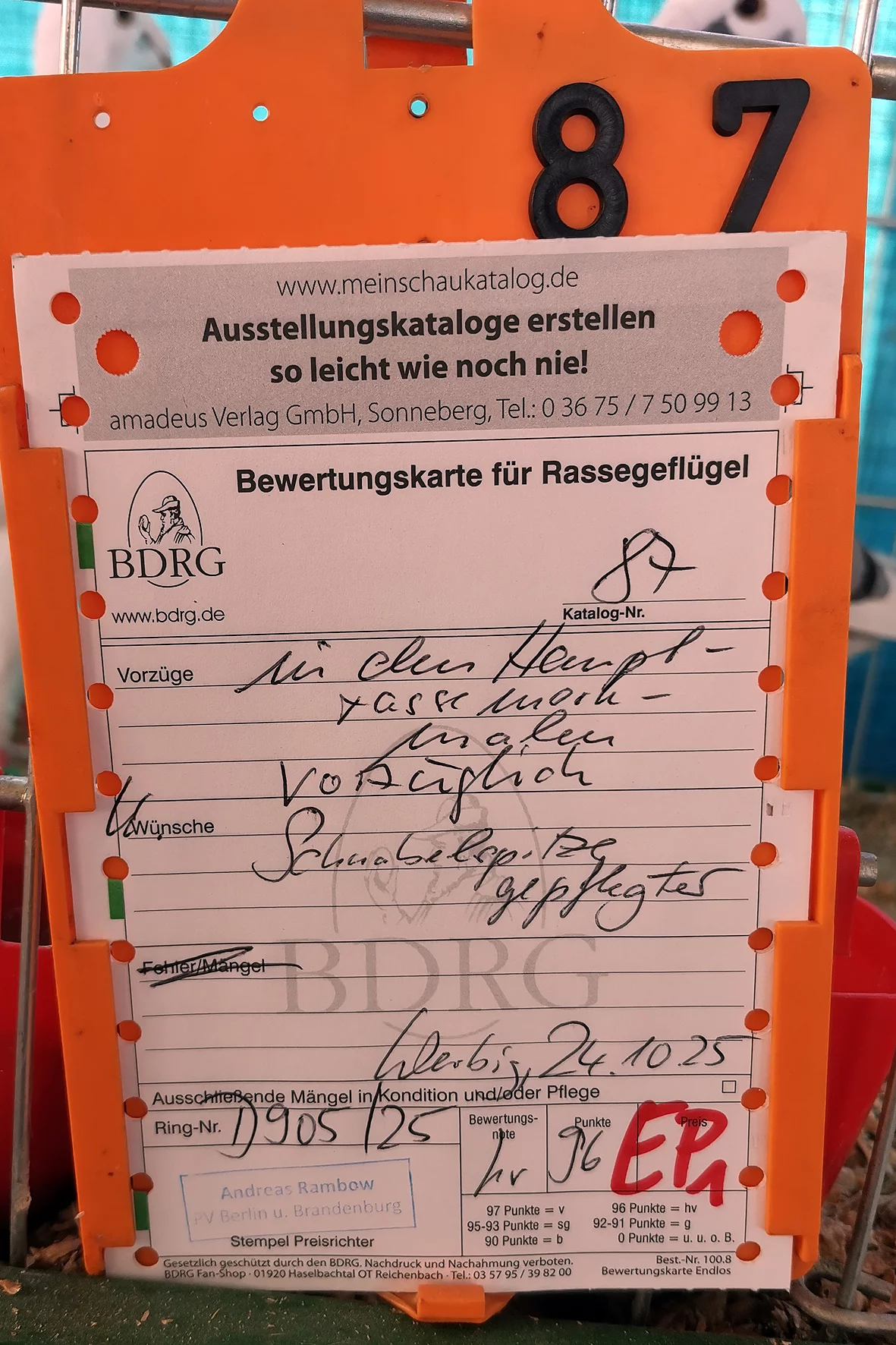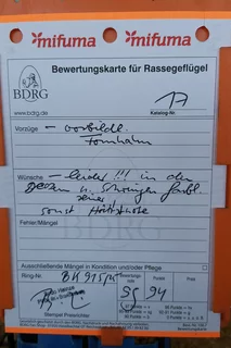 Weniger erfreulich war allerdings ein Tier, das auf einem Auge blind war. Solche Tiere sollten meiner Meinung nach nicht ausgestellt werden, da sie keine realistische Aussicht auf eine Bewertung haben und den Gesamteindruck der Schau unnötig schmälern. Etwas schade war, dass es nur ein Züchterverzeichnis gab und kein vollständiger Bewertungskatalog zur Einsicht bereitstand.