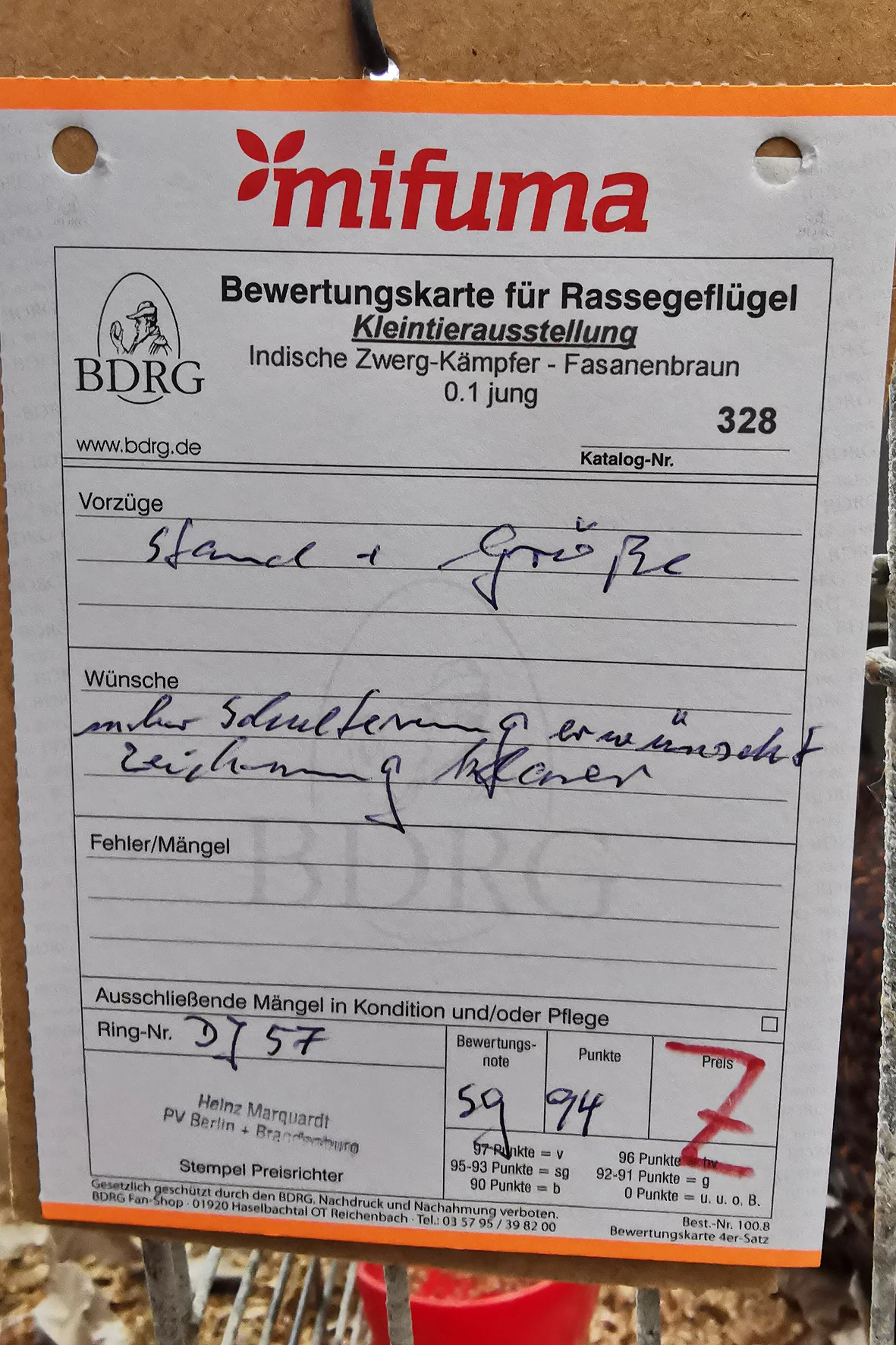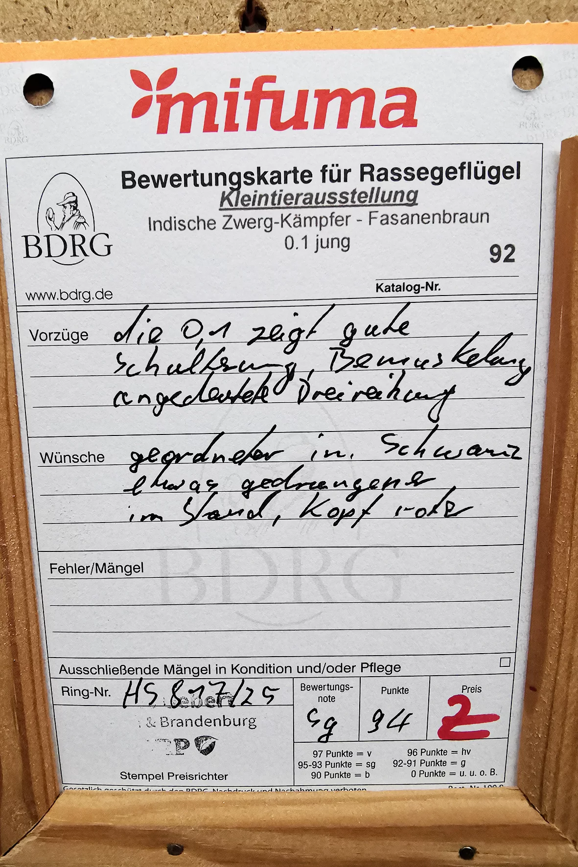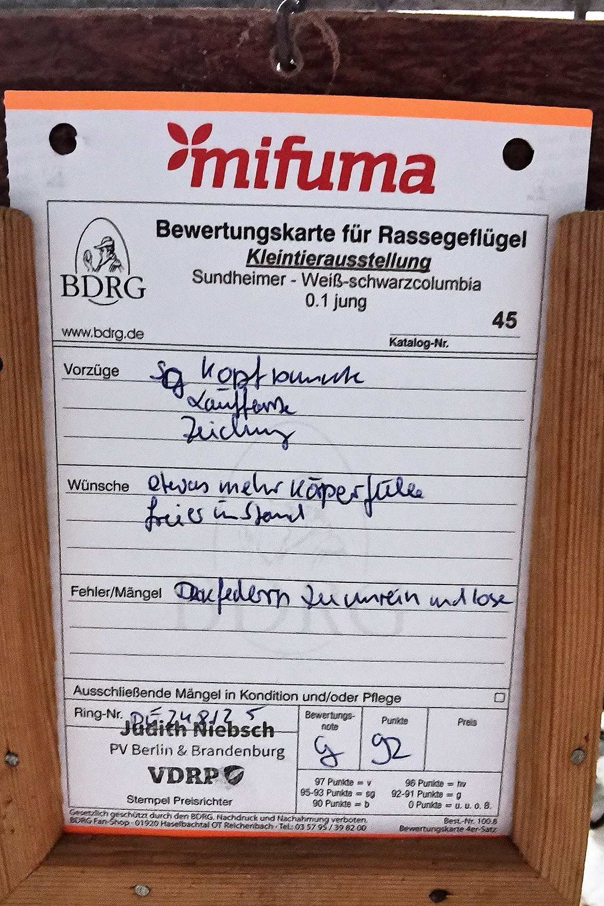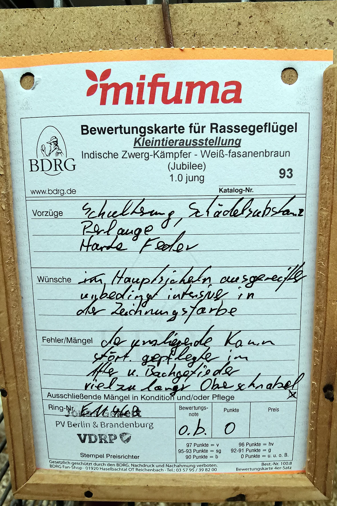 Persönlich war diese Schau für mich ein Experiment, da meine Tiere üblicherweise zu einem deutlich früheren Zeitpunkt ausgestellt werden sollten. Dies war jedoch aufgrund mehrerer Absagen nicht möglich. Nach der Absage der Schau, ließ ich Ende Oktober meine Tiere bewerten und war mit der Qualität der Sundheimer sowie unserer Indischen Zwergkämpfer zufrieden.