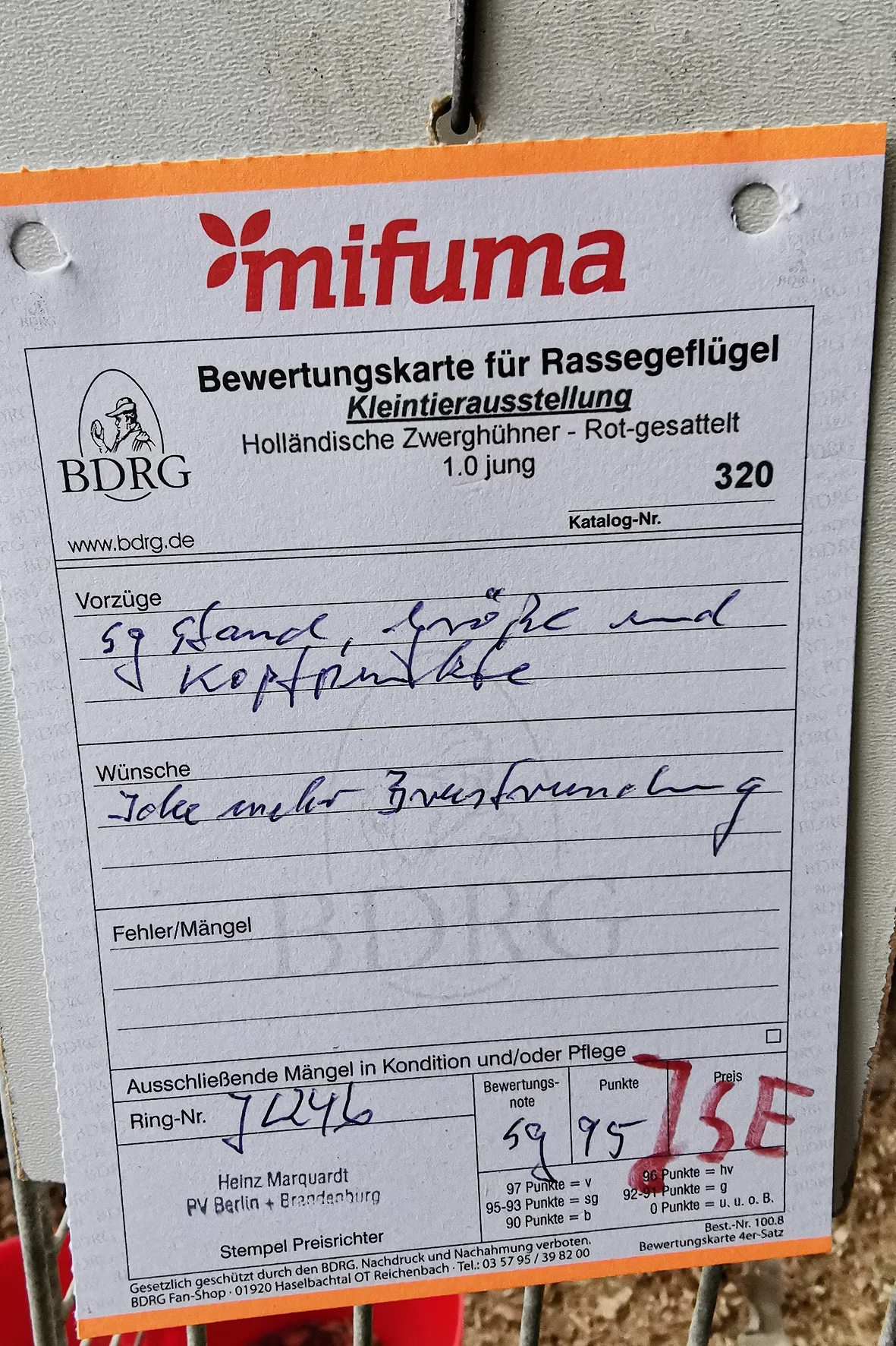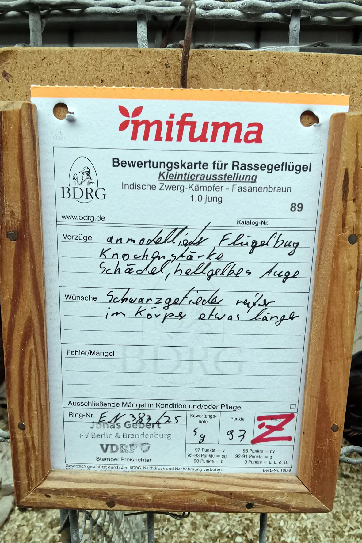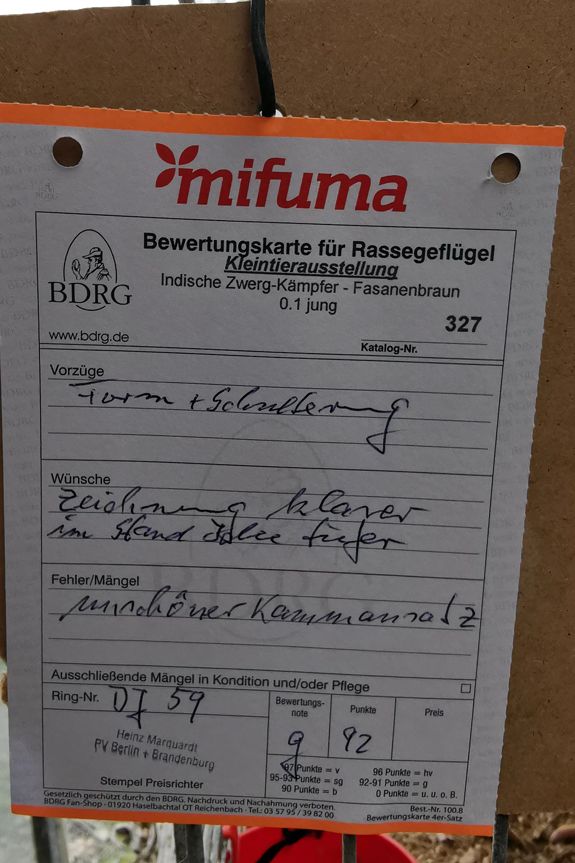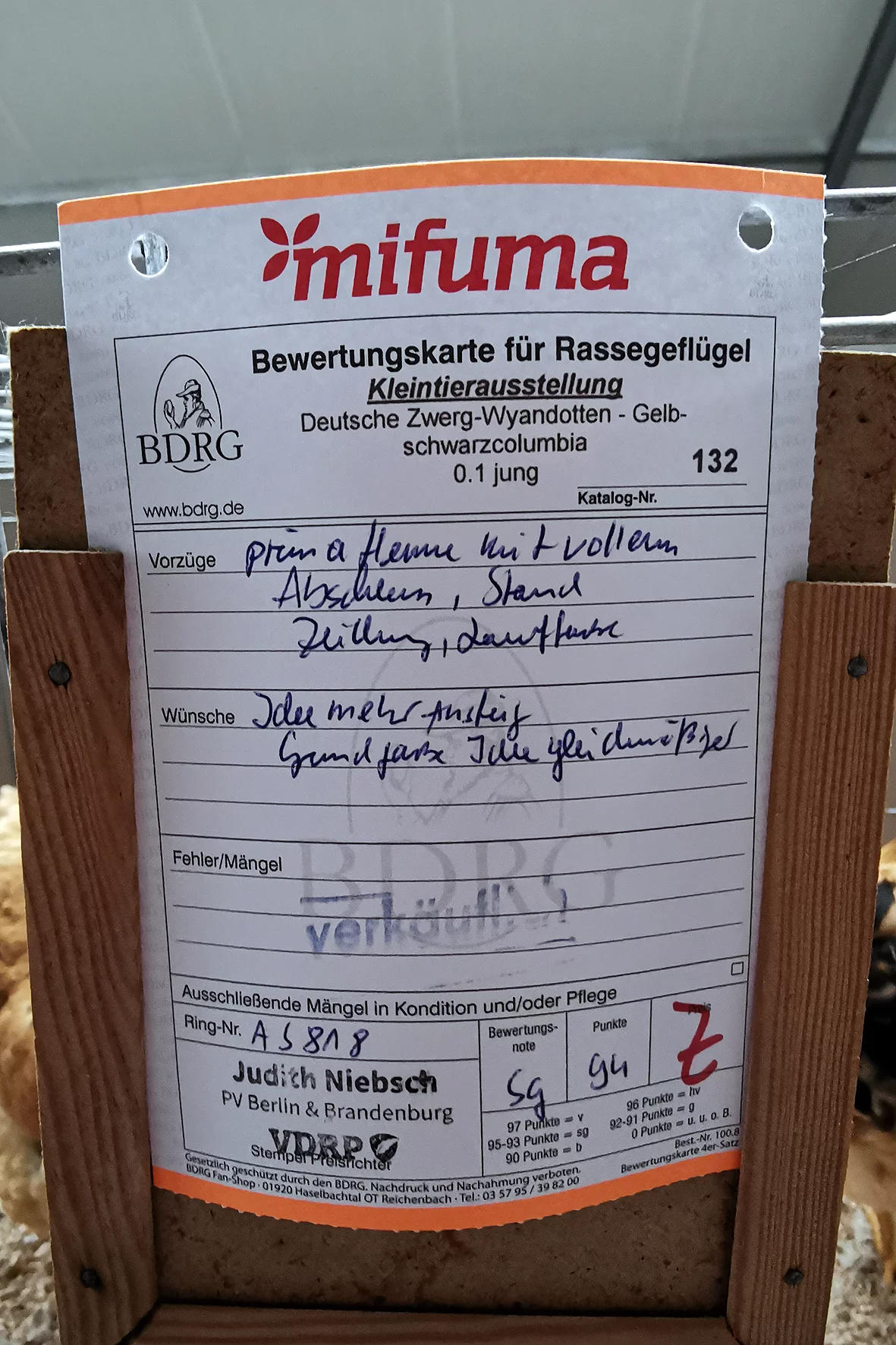 Persönlich war diese Schau für mich ein Experiment, da meine Tiere üblicherweise zu einem deutlich früheren Zeitpunkt ausgestellt werden sollten. Dies war jedoch aufgrund mehrerer Absagen nicht möglich. Nach der Absage der Schau, ließ ich Ende Oktober meine Tiere bewerten und war mit der Qualität der Sundheimer sowie unserer Indischen Zwergkämpfer zufrieden.