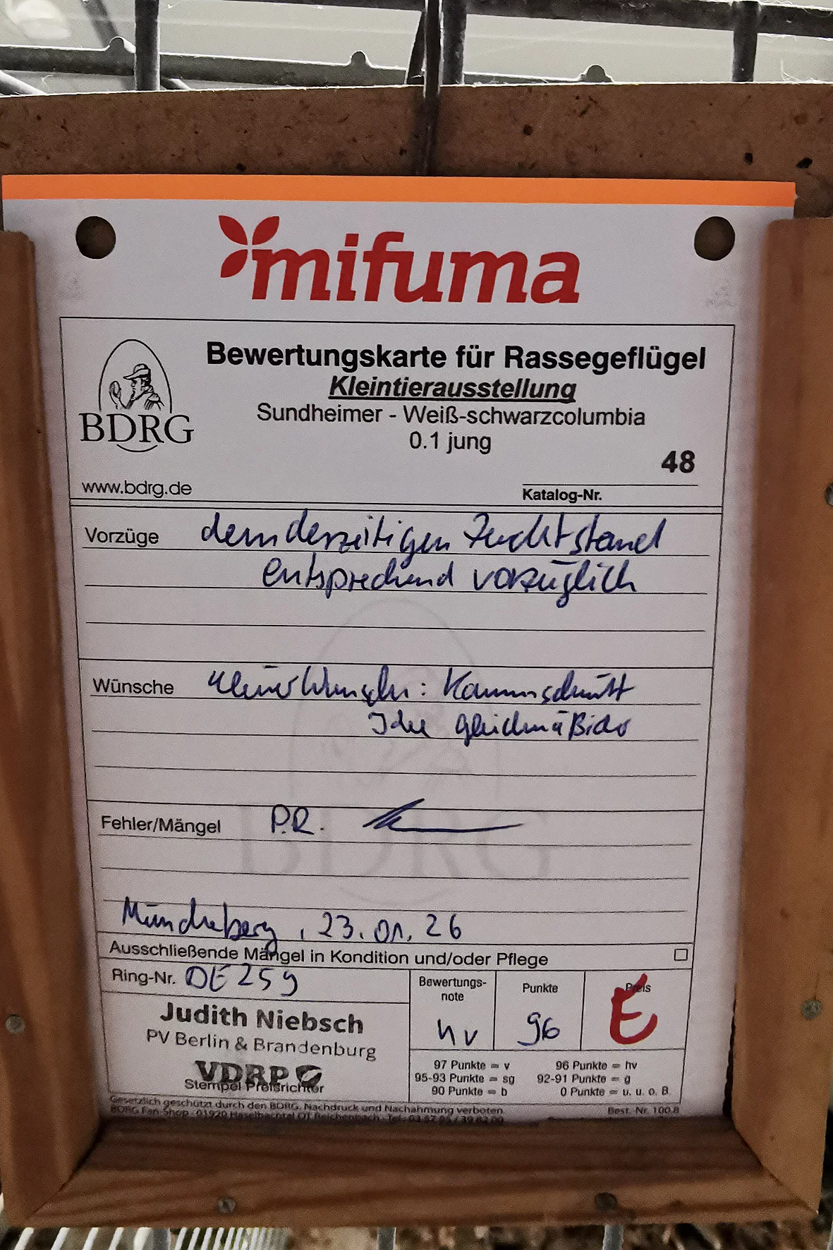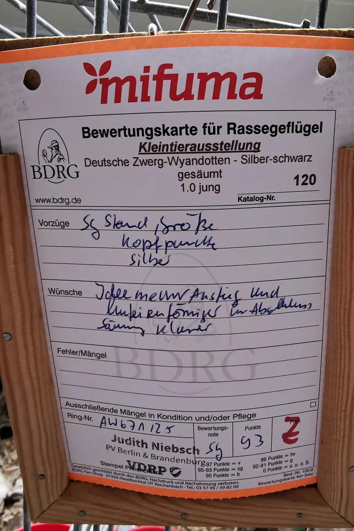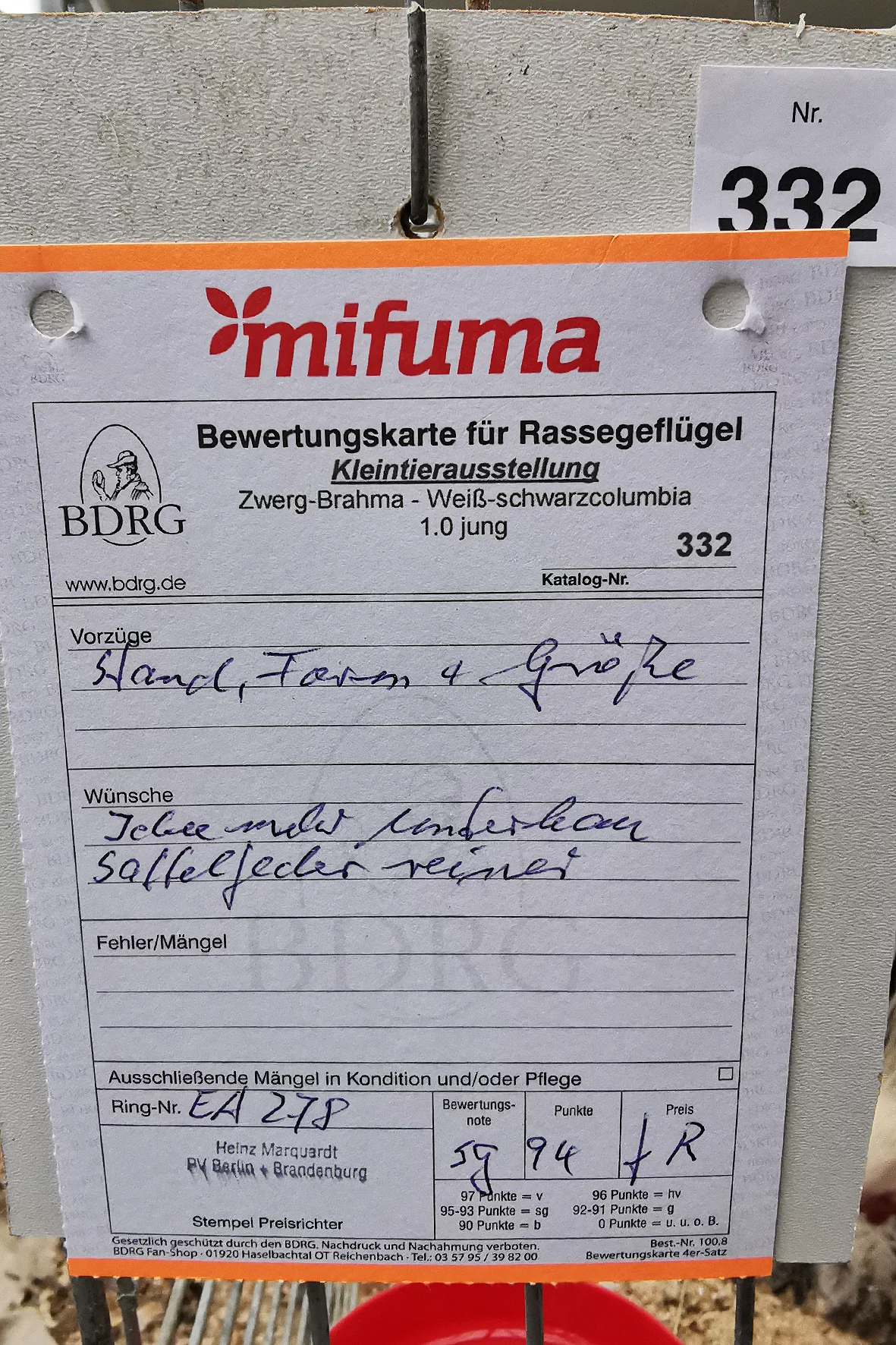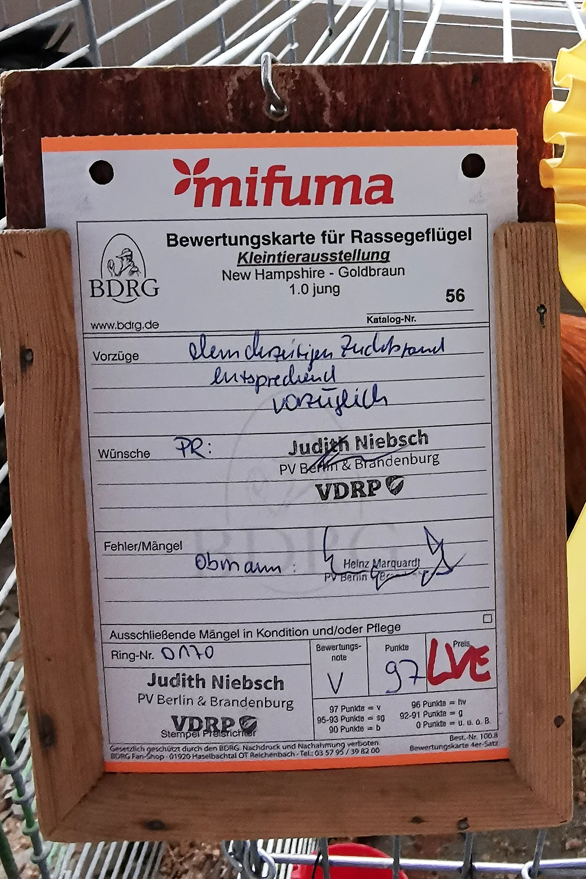 Persönlich war diese Schau für mich ein Experiment, da meine Tiere üblicherweise zu einem deutlich früheren Zeitpunkt ausgestellt werden sollten. Dies war jedoch aufgrund mehrerer Absagen nicht möglich. Nach der Absage der Schau, ließ ich Ende Oktober meine Tiere bewerten und war mit der Qualität der Sundheimer sowie unserer Indischen Zwergkämpfer zufrieden.