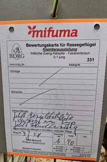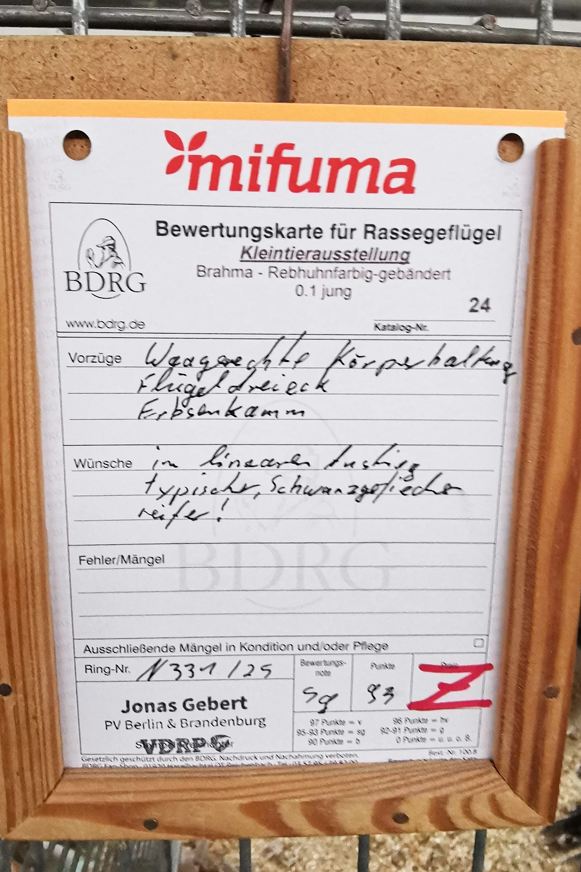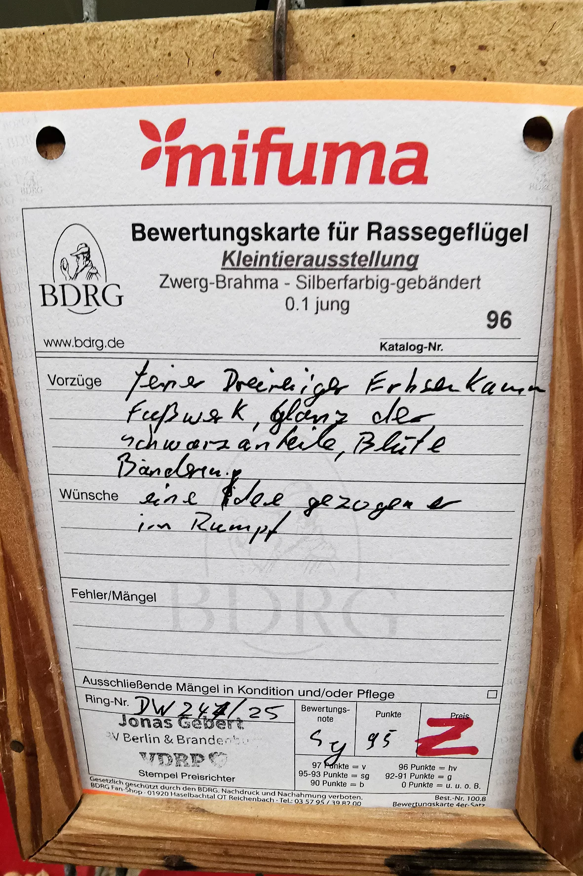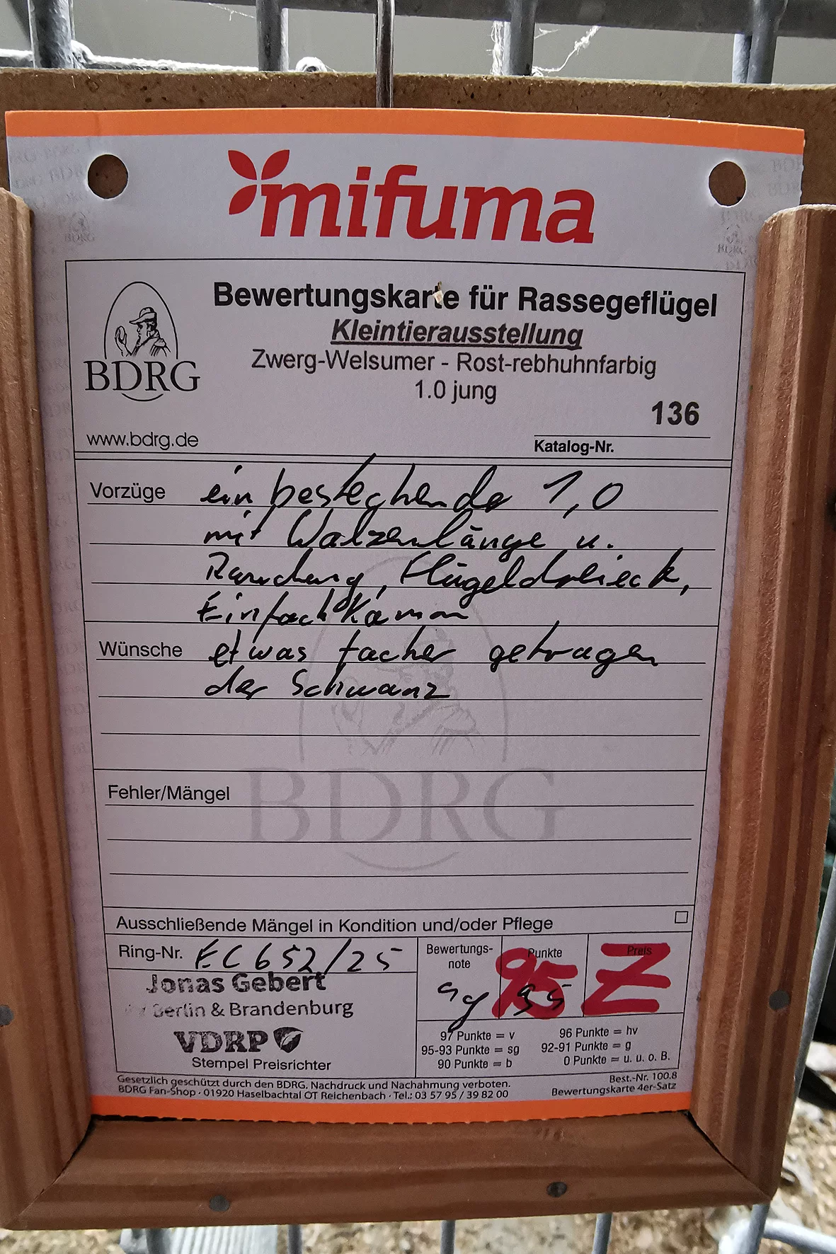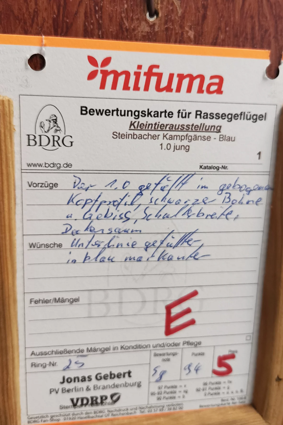 Persönlich war diese Schau für mich ein Experiment, da meine Tiere üblicherweise zu einem deutlich früheren Zeitpunkt ausgestellt werden sollten. Dies war jedoch aufgrund mehrerer Absagen nicht möglich. Nach der Absage der Schau, ließ ich Ende Oktober meine Tiere bewerten und war mit der Qualität der Sundheimer sowie unserer Indischen Zwergkämpfer zufrieden.