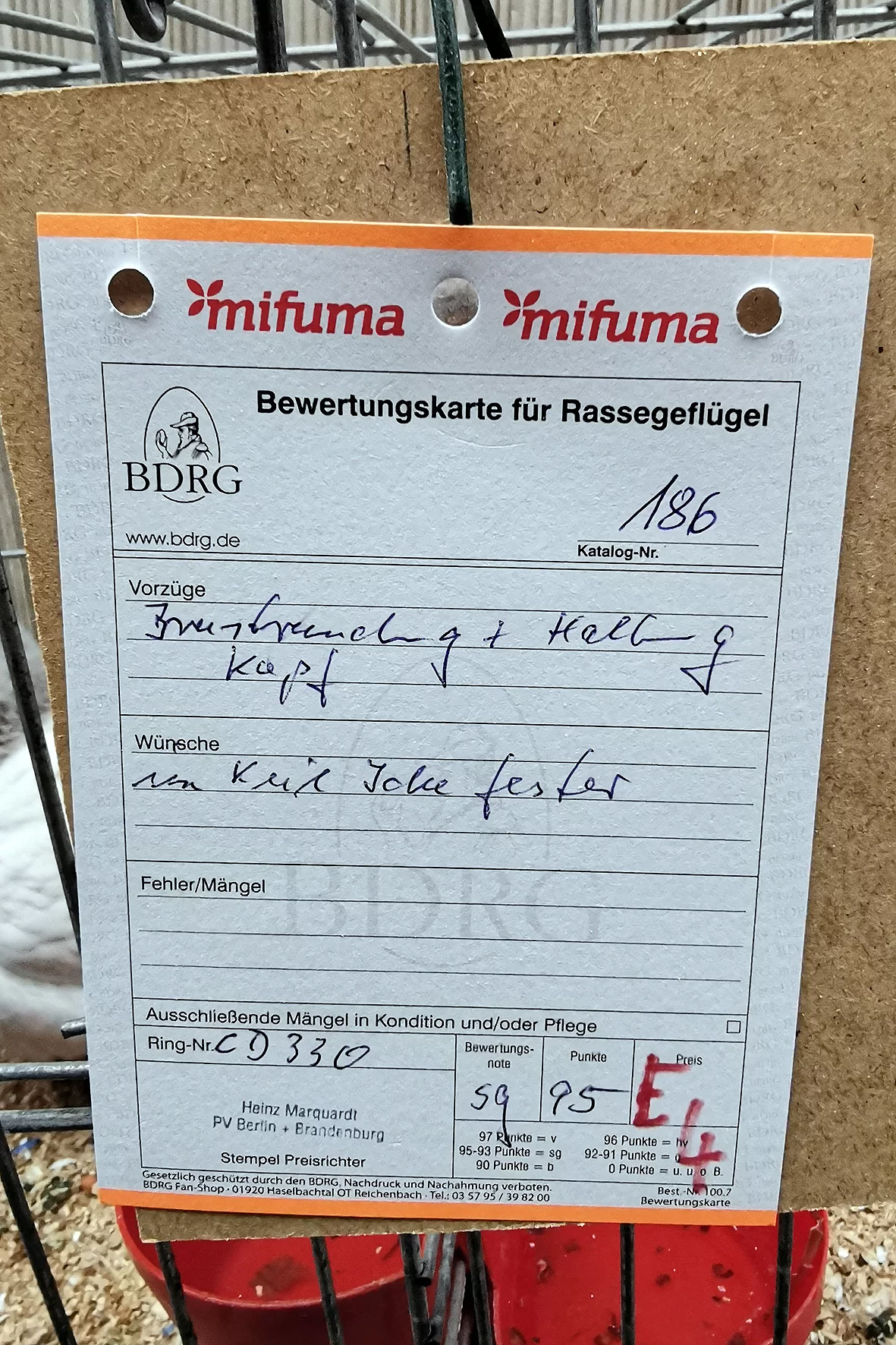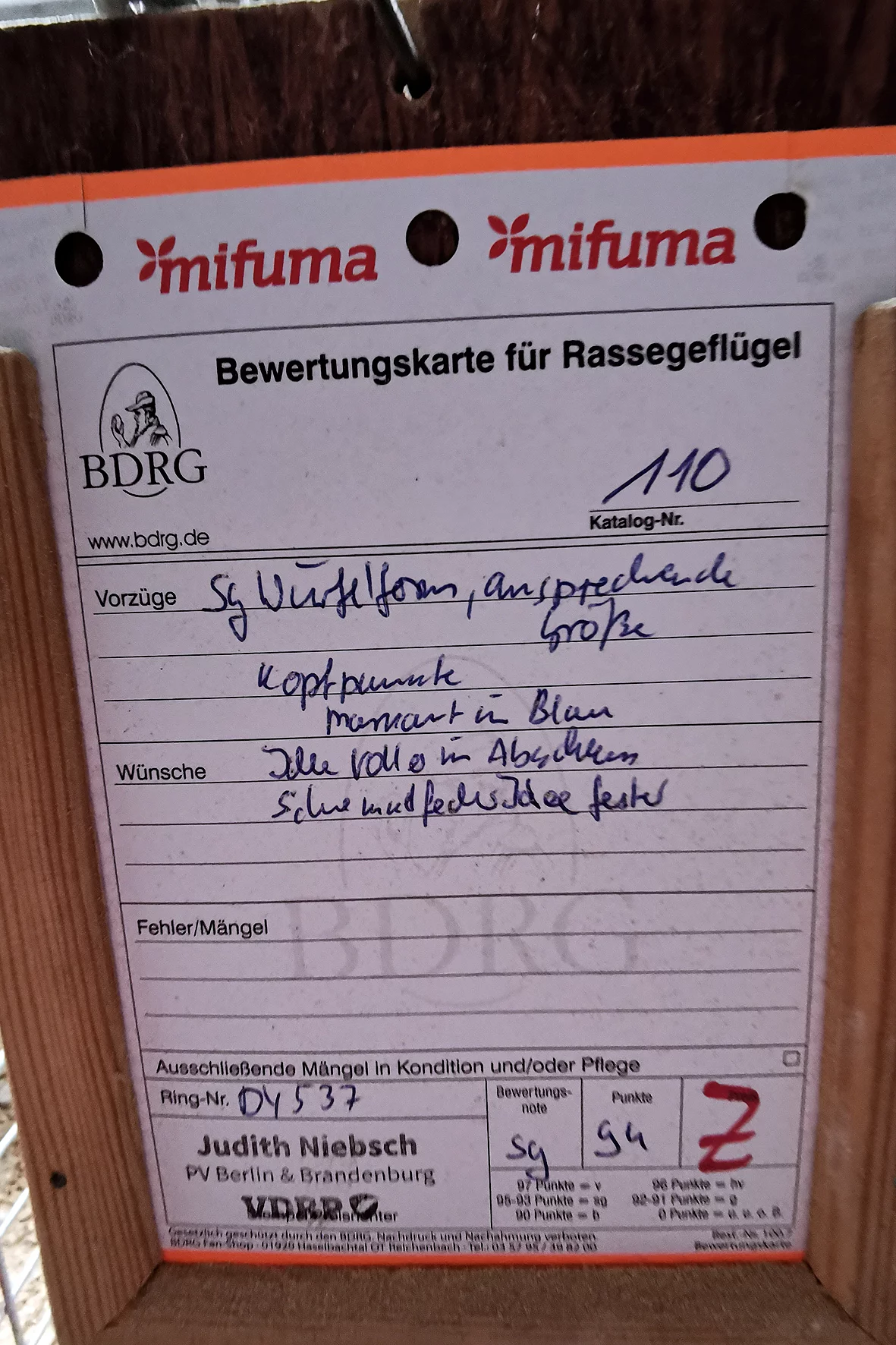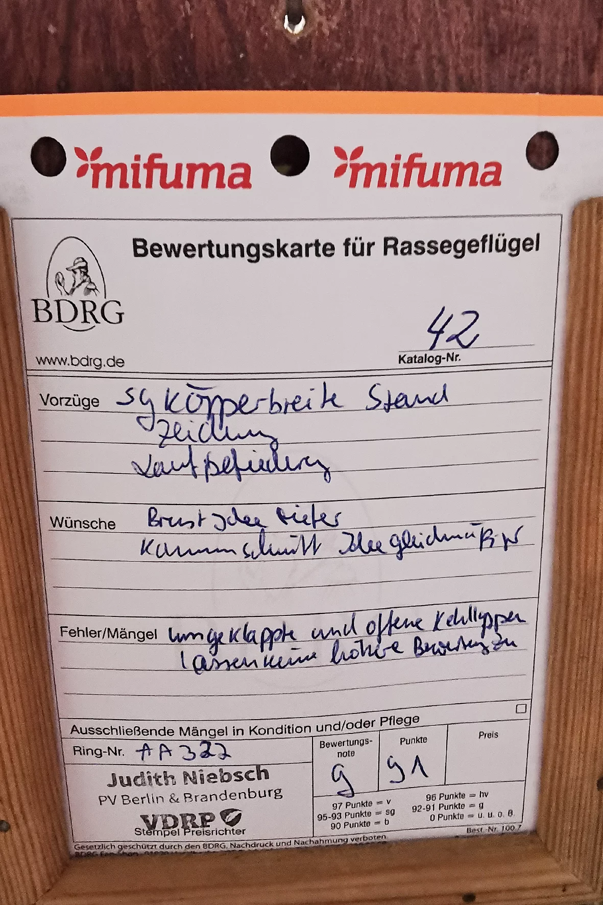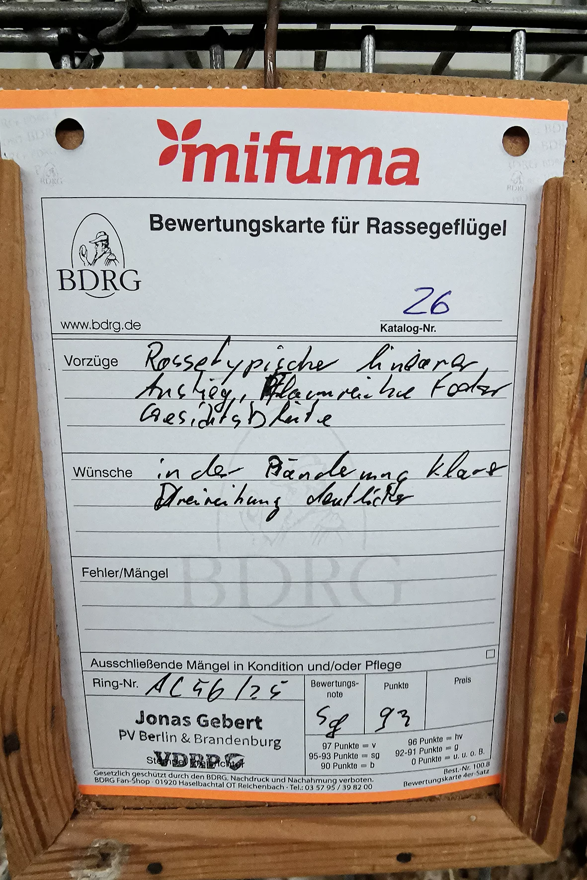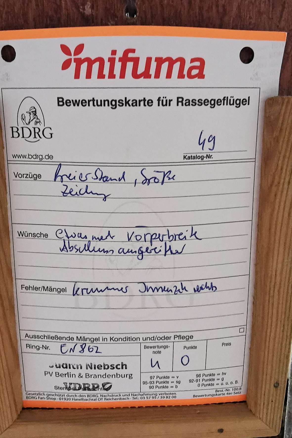 Umso auffälliger war es, dass die Bewertungen bei dieser Schau mehrfach zwei bis drei Punkte unter der vorherigen Bewertung lagen. Woran dies letztlich lag, lässt sich nur spekulieren. Ein entscheidender Faktor dürfte jedoch die Zeit gewesen sein, die gegen die Blüte der Tiere gearbeitet hat. Hinzu kommt, dass die Tiere bereits Mitte November mit dem Legen begonnen hatten.