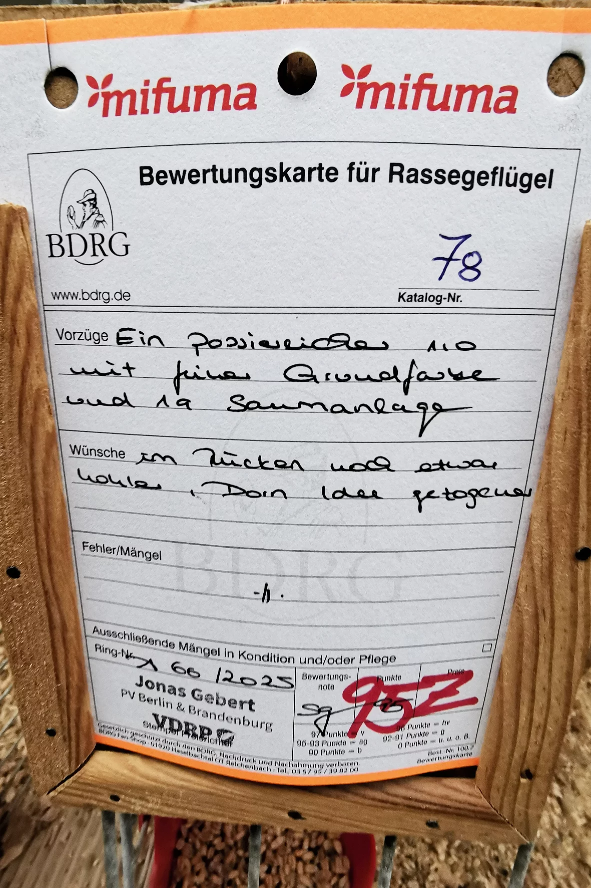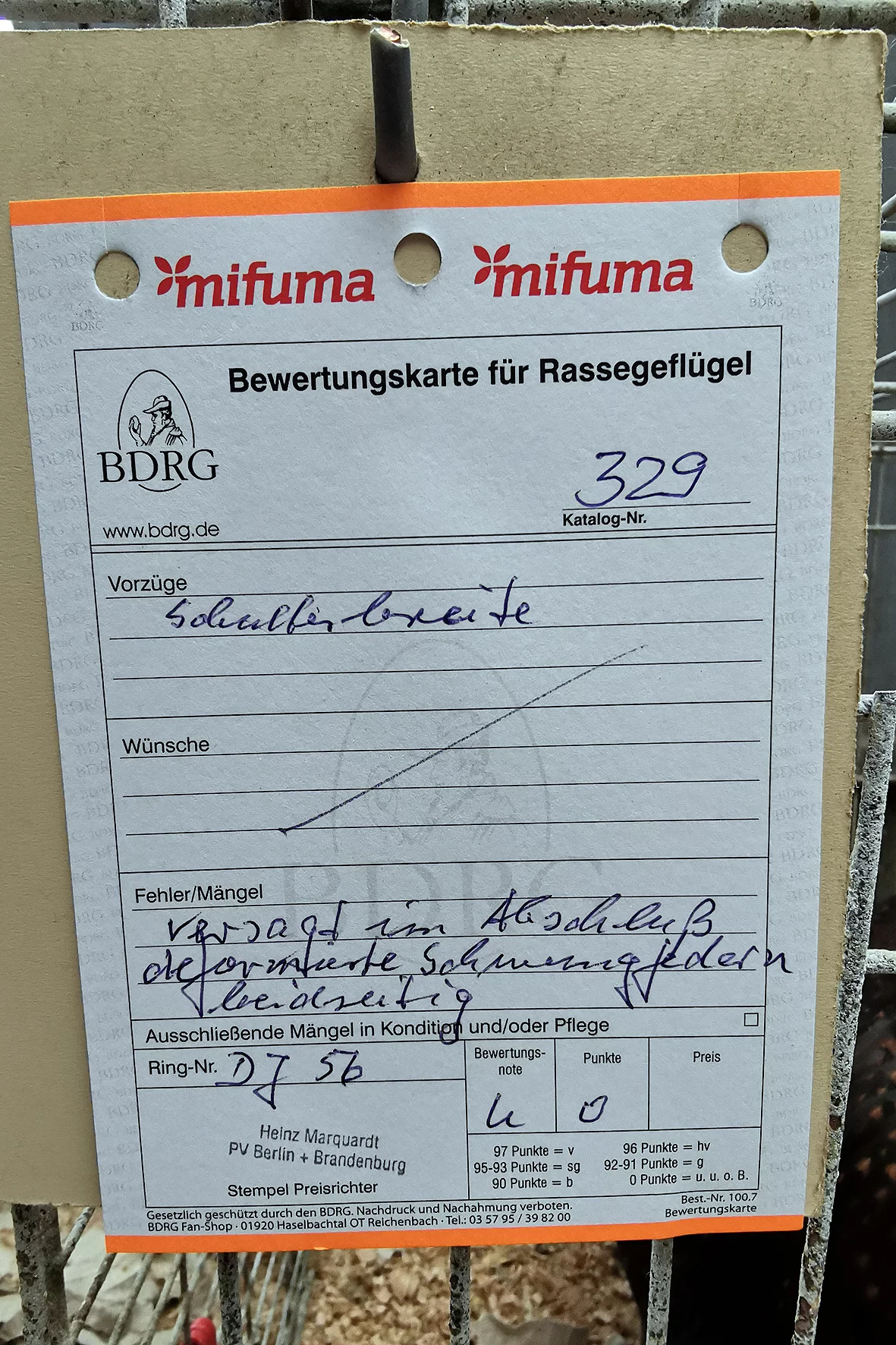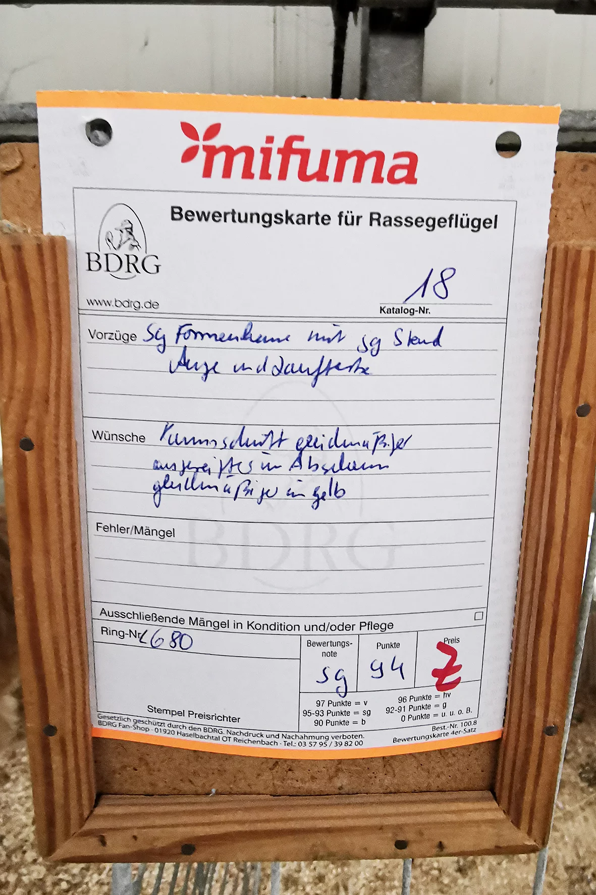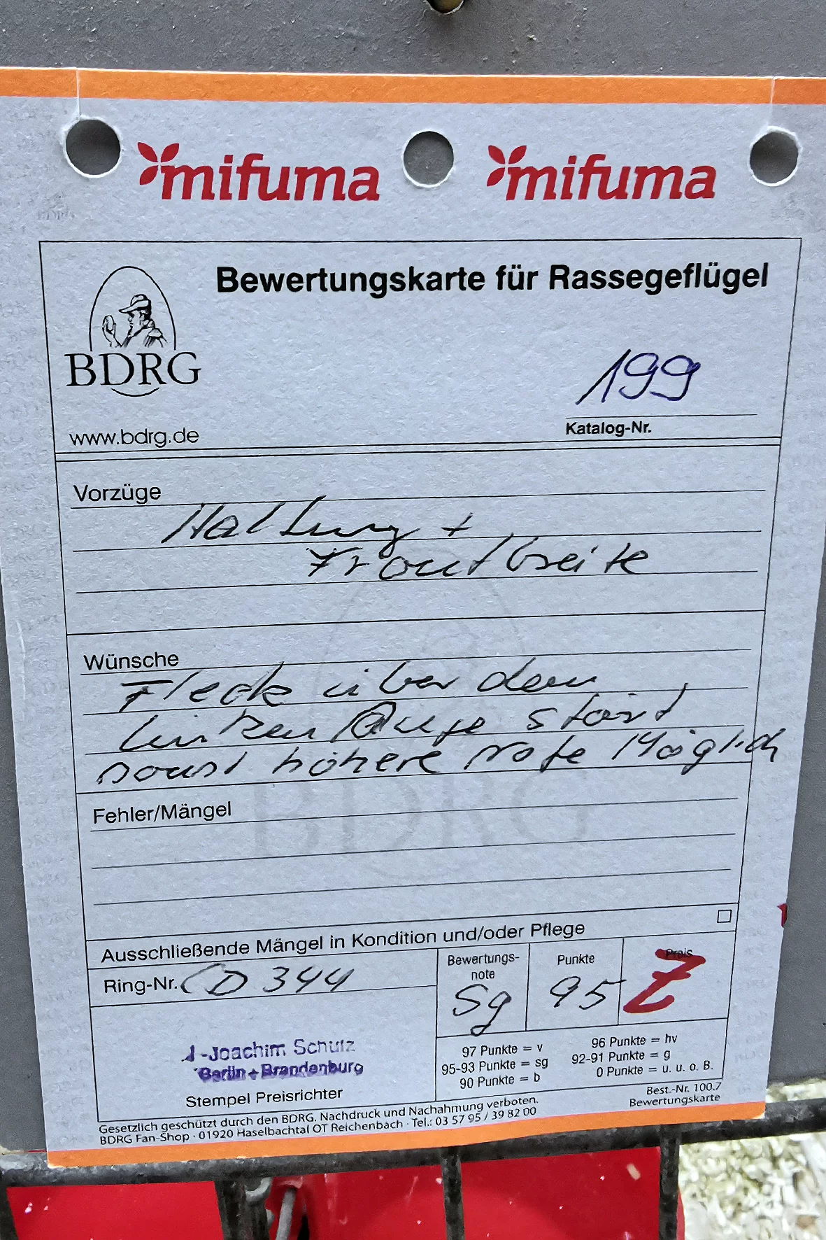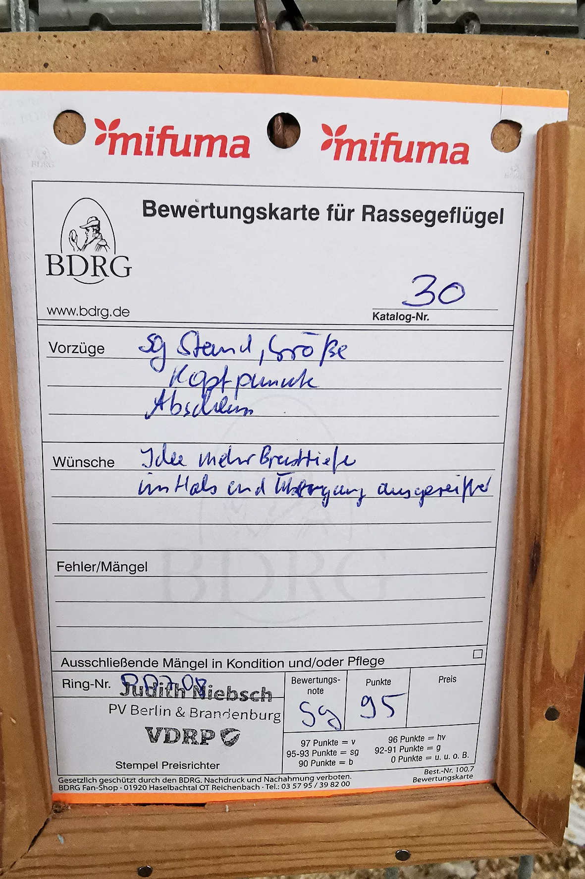 Umso auffälliger war es, dass die Bewertungen bei dieser Schau mehrfach zwei bis drei Punkte unter der vorherigen Bewertung lagen. Woran dies letztlich lag, lässt sich nur spekulieren. Ein entscheidender Faktor dürfte jedoch die Zeit gewesen sein, die gegen die Blüte der Tiere gearbeitet hat. Hinzu kommt, dass die Tiere bereits Mitte November mit dem Legen begonnen hatten.