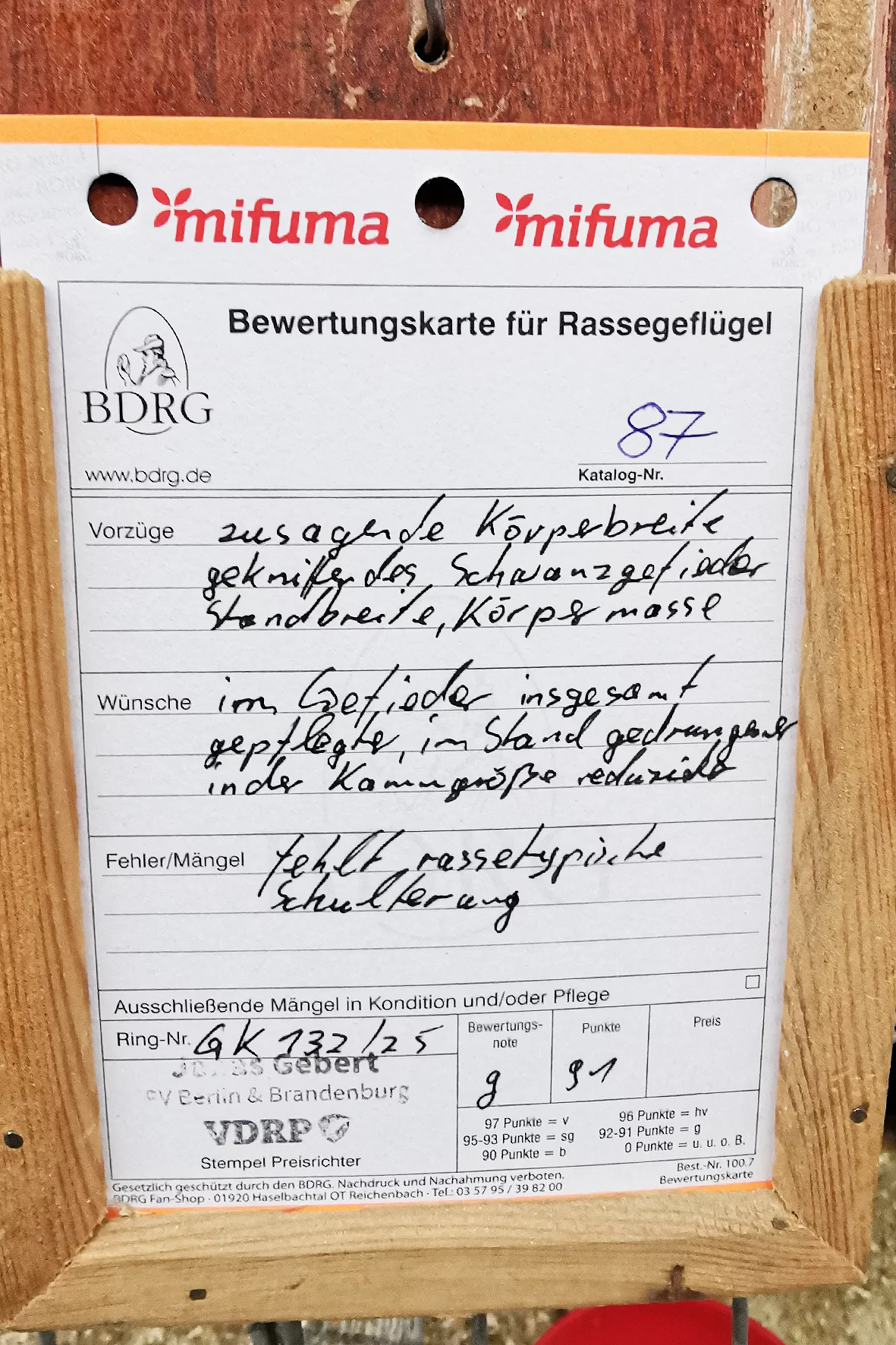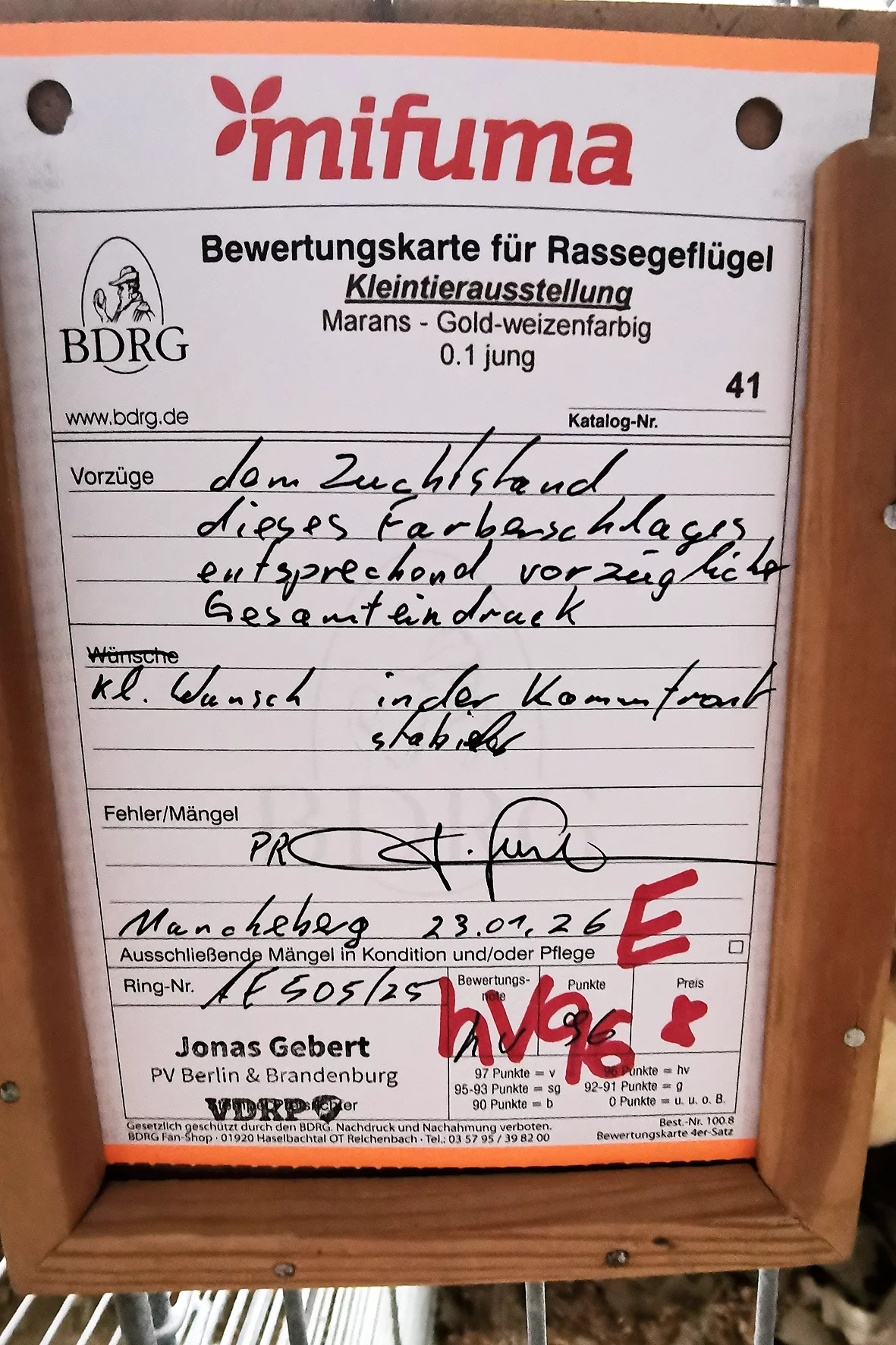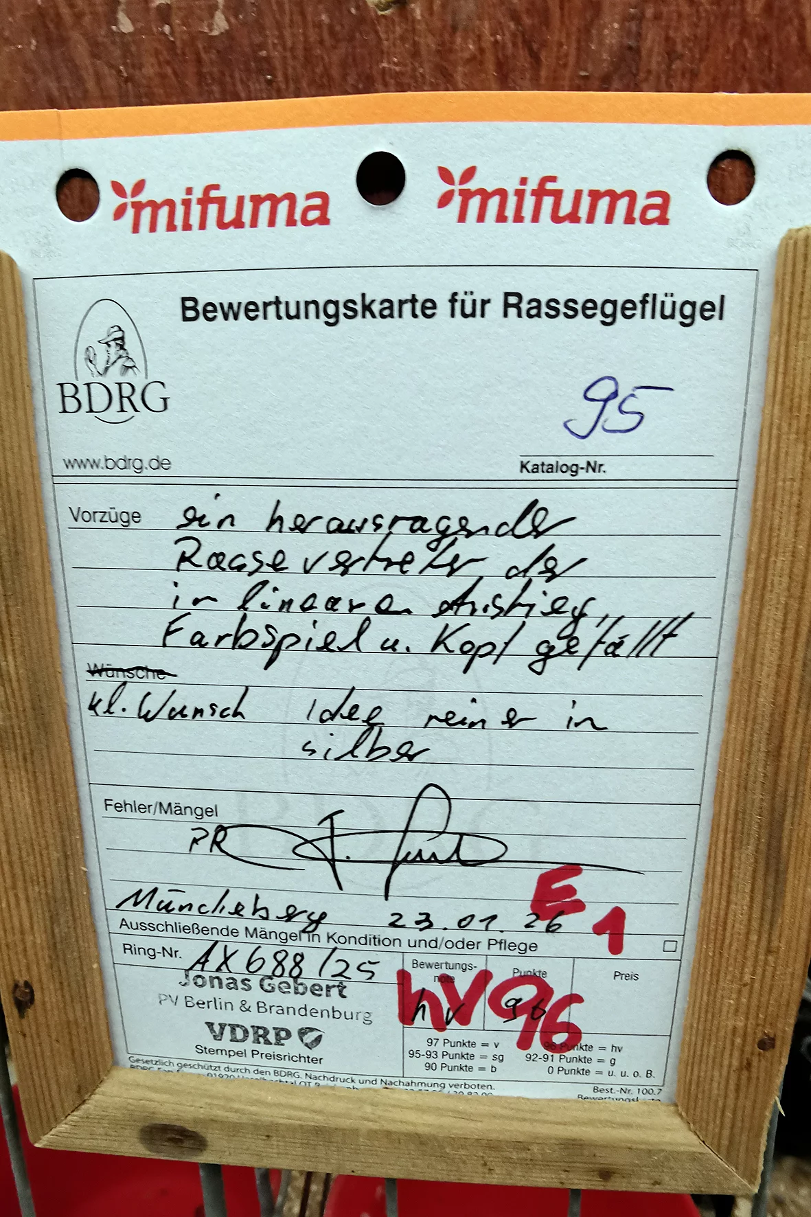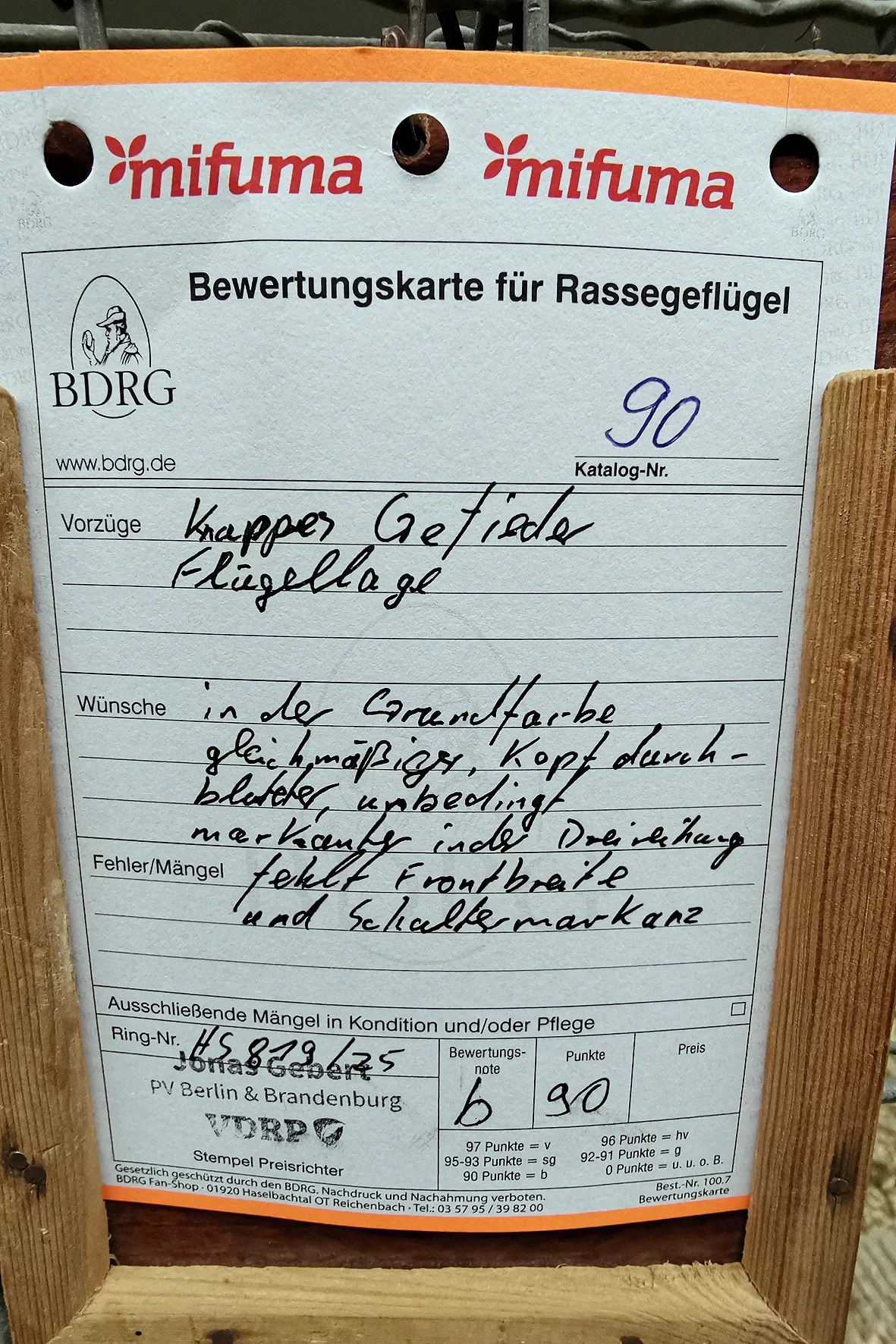 Umso auffälliger war es, dass die Bewertungen bei dieser Schau mehrfach zwei bis drei Punkte unter der vorherigen Bewertung lagen. Woran dies letztlich lag, lässt sich nur spekulieren. Ein entscheidender Faktor dürfte jedoch die Zeit gewesen sein, die gegen die Blüte der Tiere gearbeitet hat. Hinzu kommt, dass die Tiere bereits Mitte November mit dem Legen begonnen hatten.