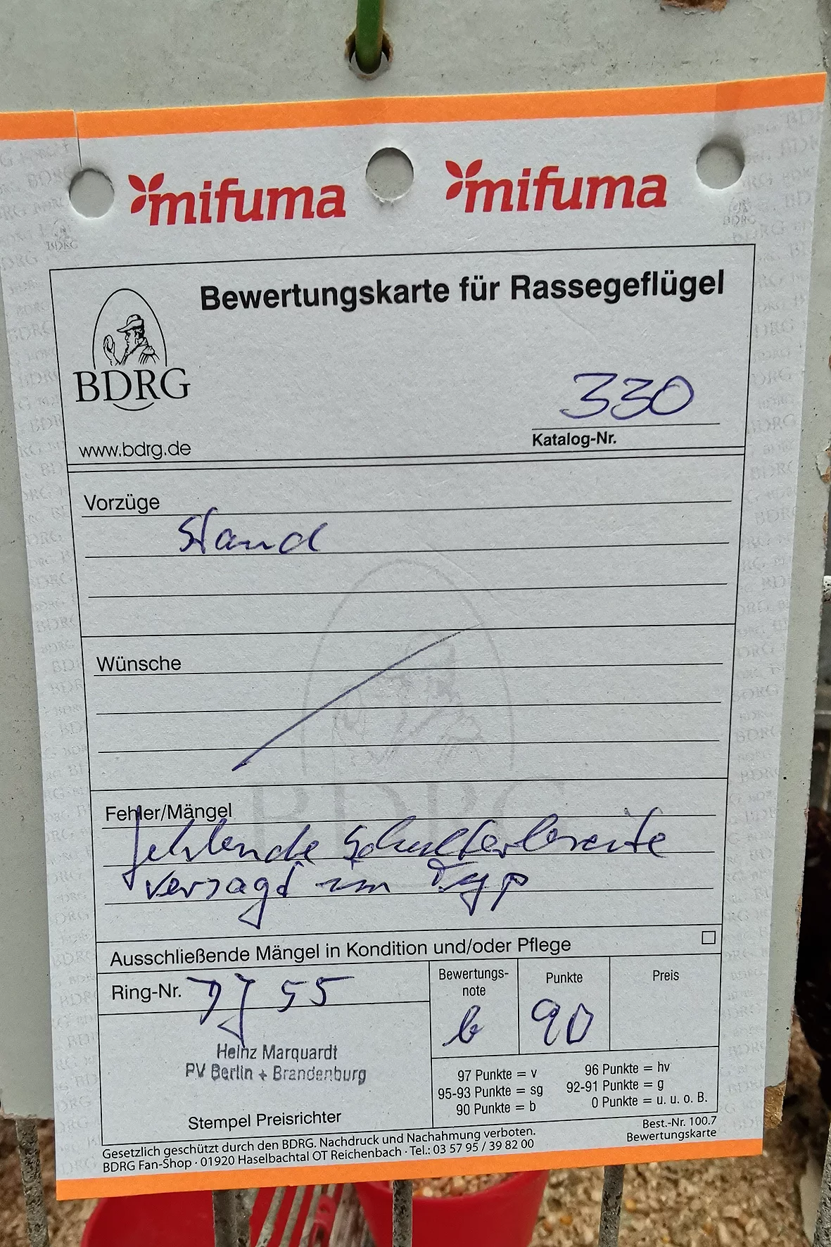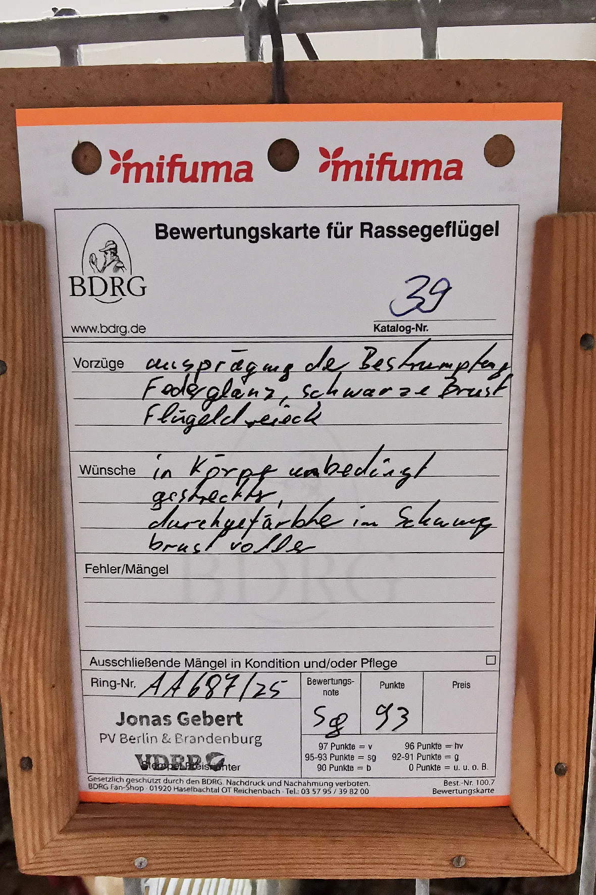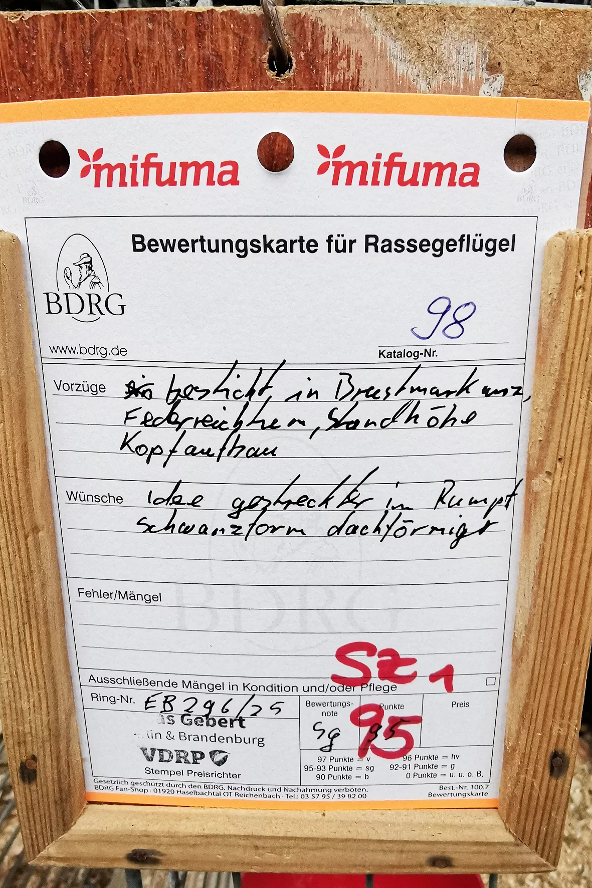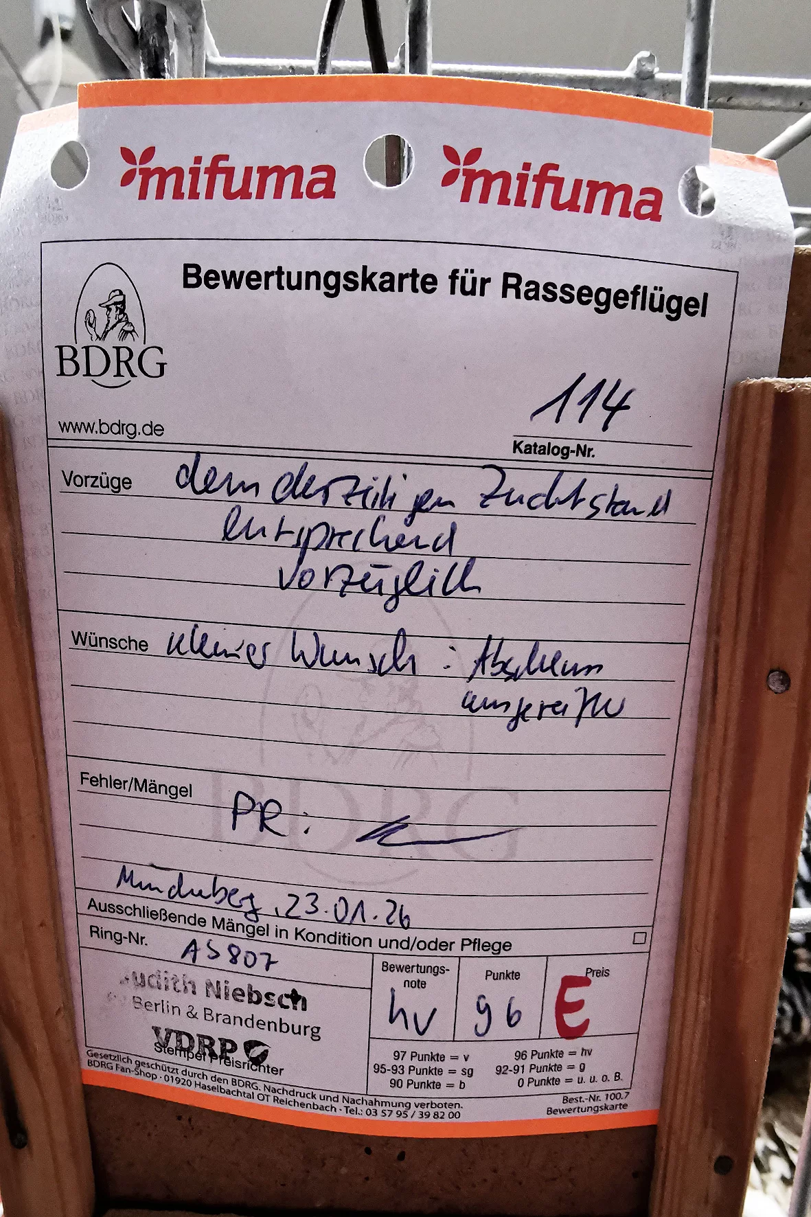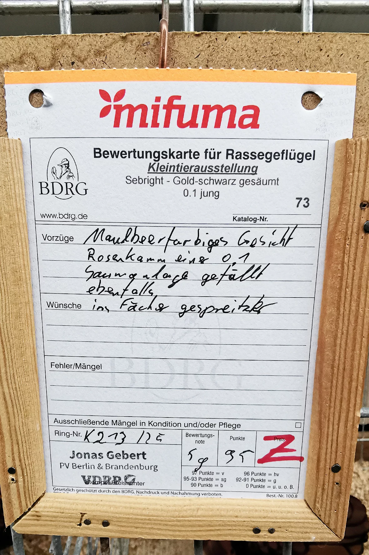 Umso auffälliger war es, dass die Bewertungen bei dieser Schau mehrfach zwei bis drei Punkte unter der vorherigen Bewertung lagen. Woran dies letztlich lag, lässt sich nur spekulieren. Ein entscheidender Faktor dürfte jedoch die Zeit gewesen sein, die gegen die Blüte der Tiere gearbeitet hat. Hinzu kommt, dass die Tiere bereits Mitte November mit dem Legen begonnen hatten.