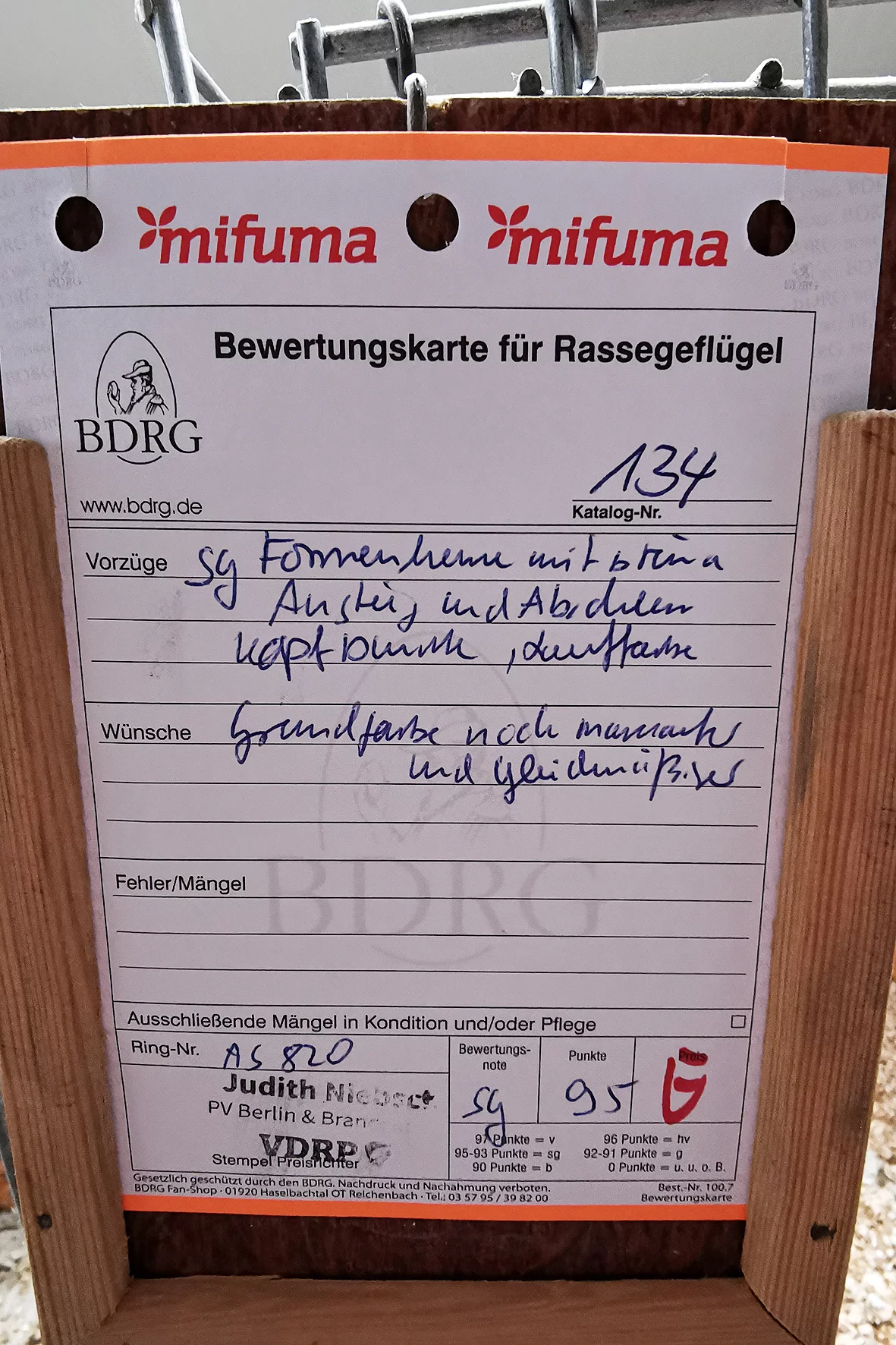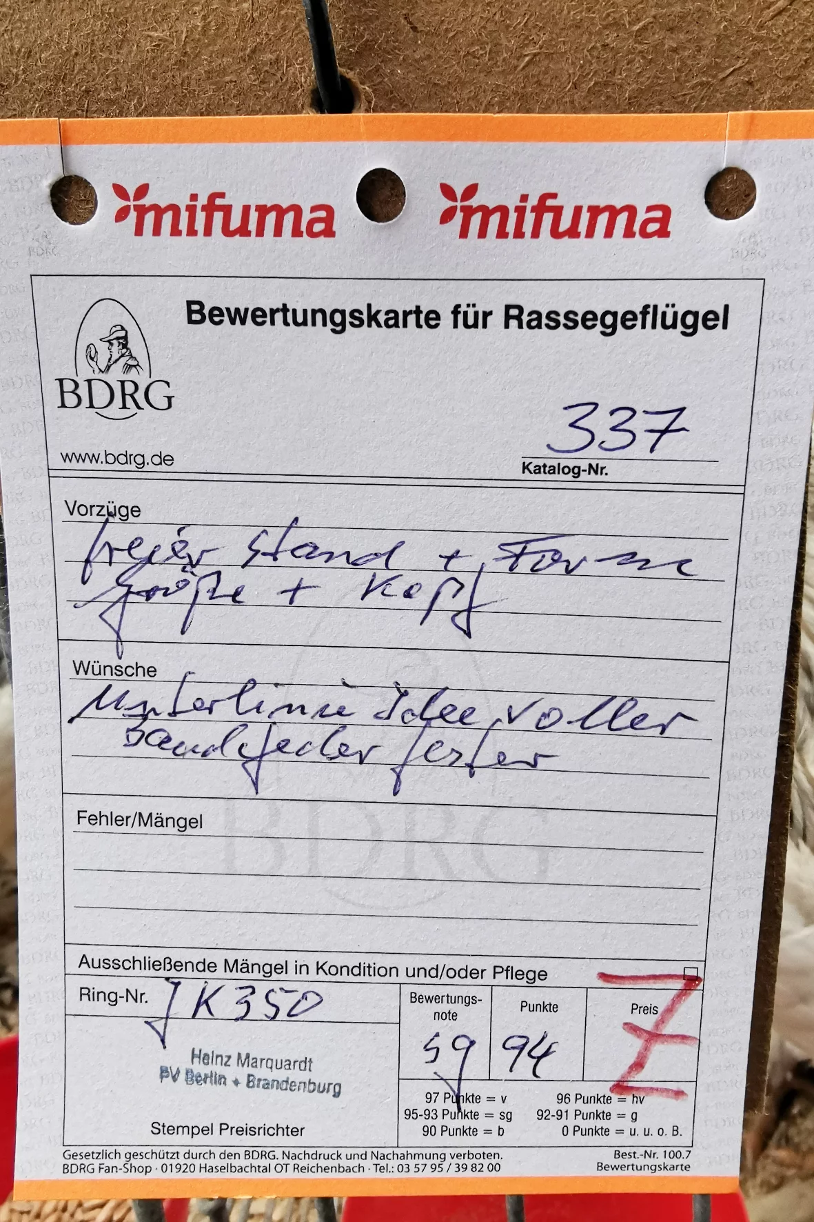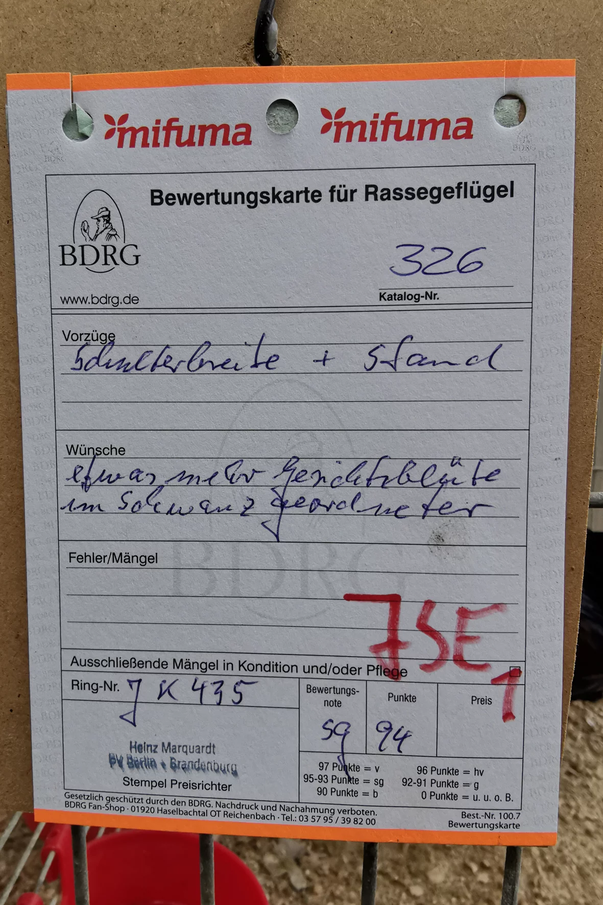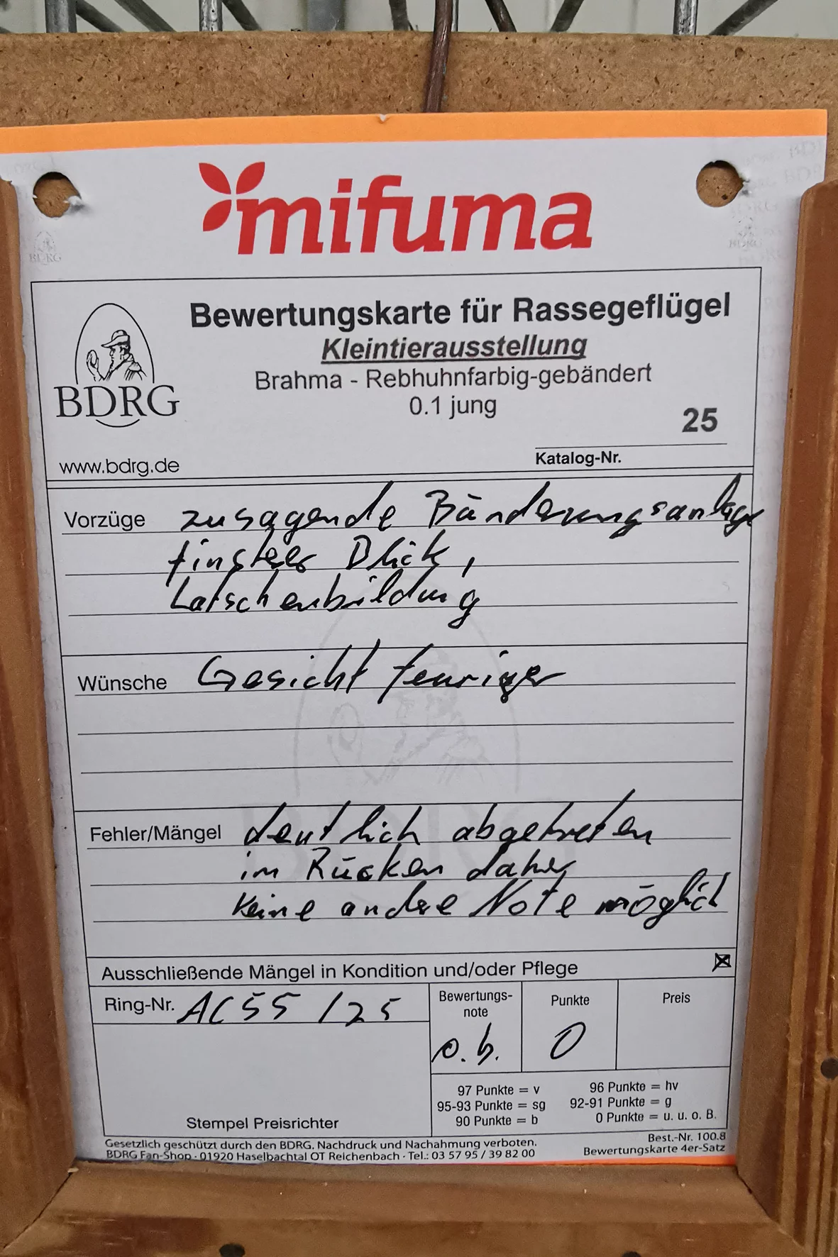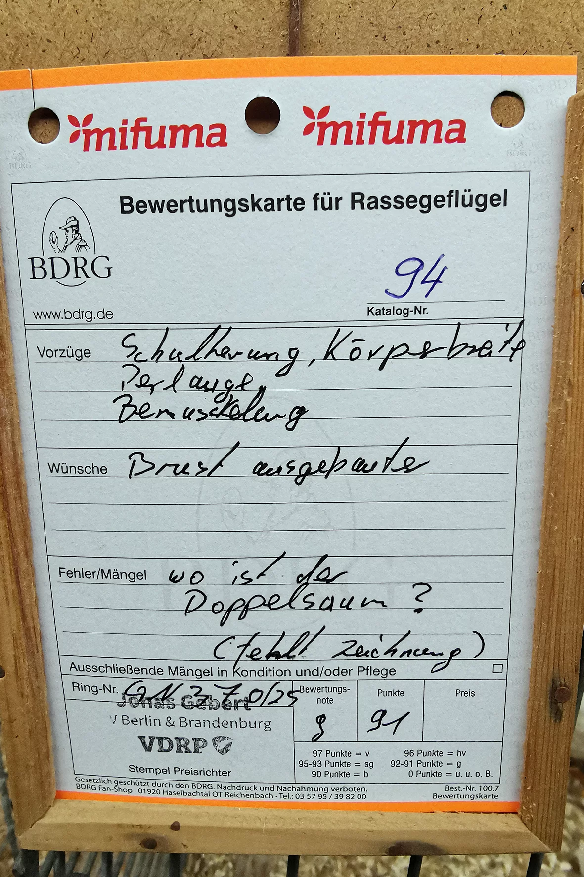 Umso auffälliger war es, dass die Bewertungen bei dieser Schau mehrfach zwei bis drei Punkte unter der vorherigen Bewertung lagen. Woran dies letztlich lag, lässt sich nur spekulieren. Ein entscheidender Faktor dürfte jedoch die Zeit gewesen sein, die gegen die Blüte der Tiere gearbeitet hat. Hinzu kommt, dass die Tiere bereits Mitte November mit dem Legen begonnen hatten.