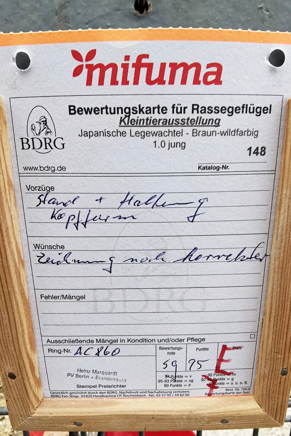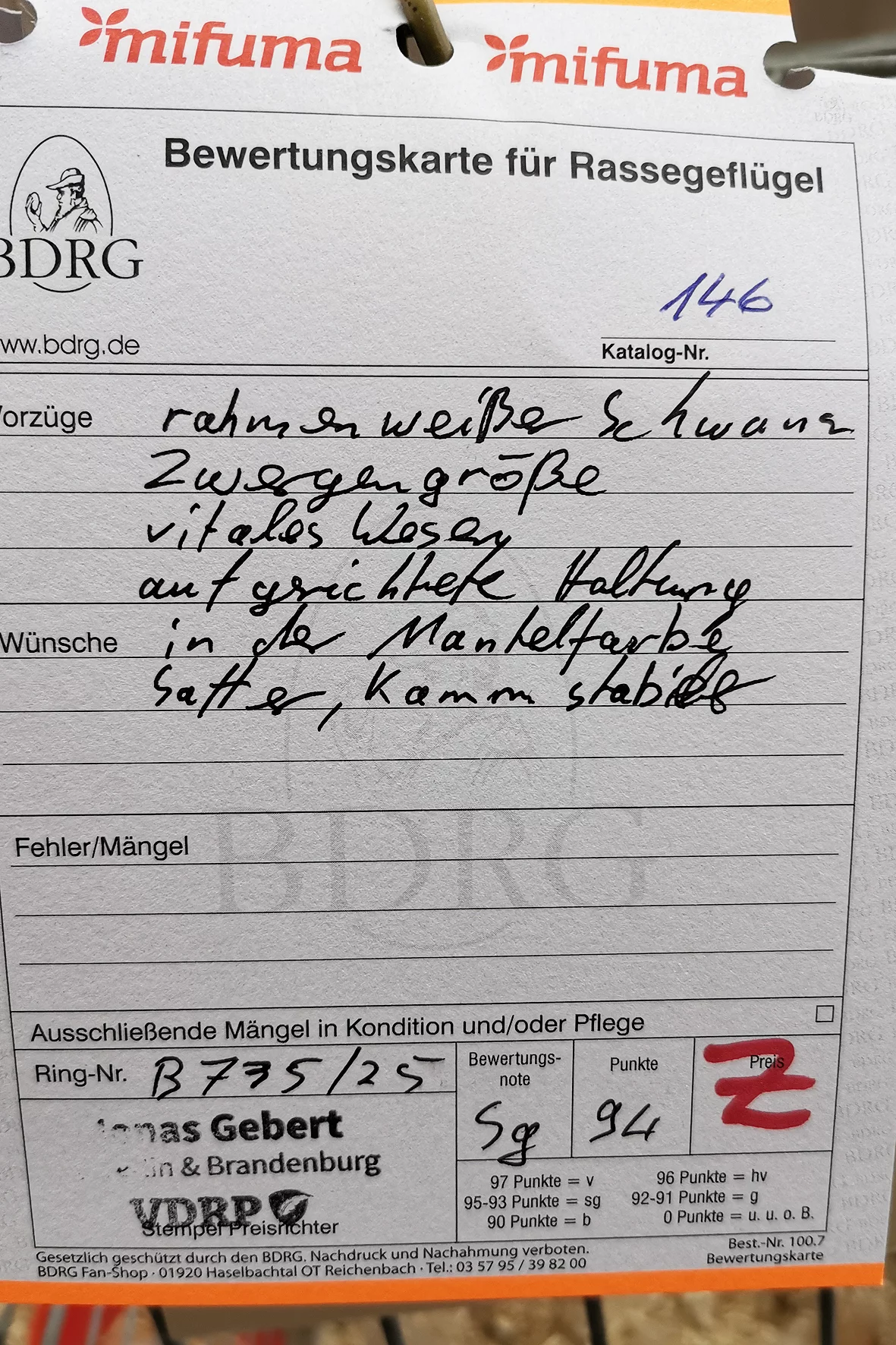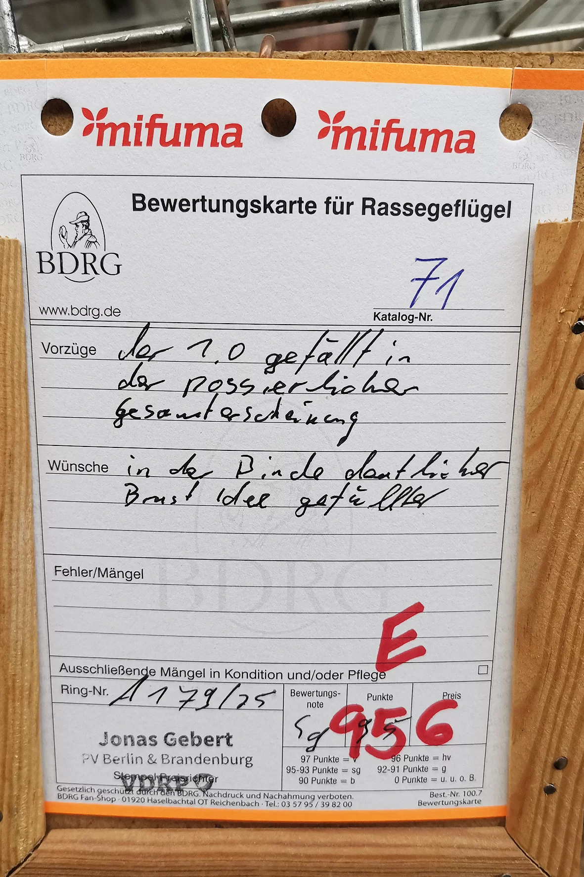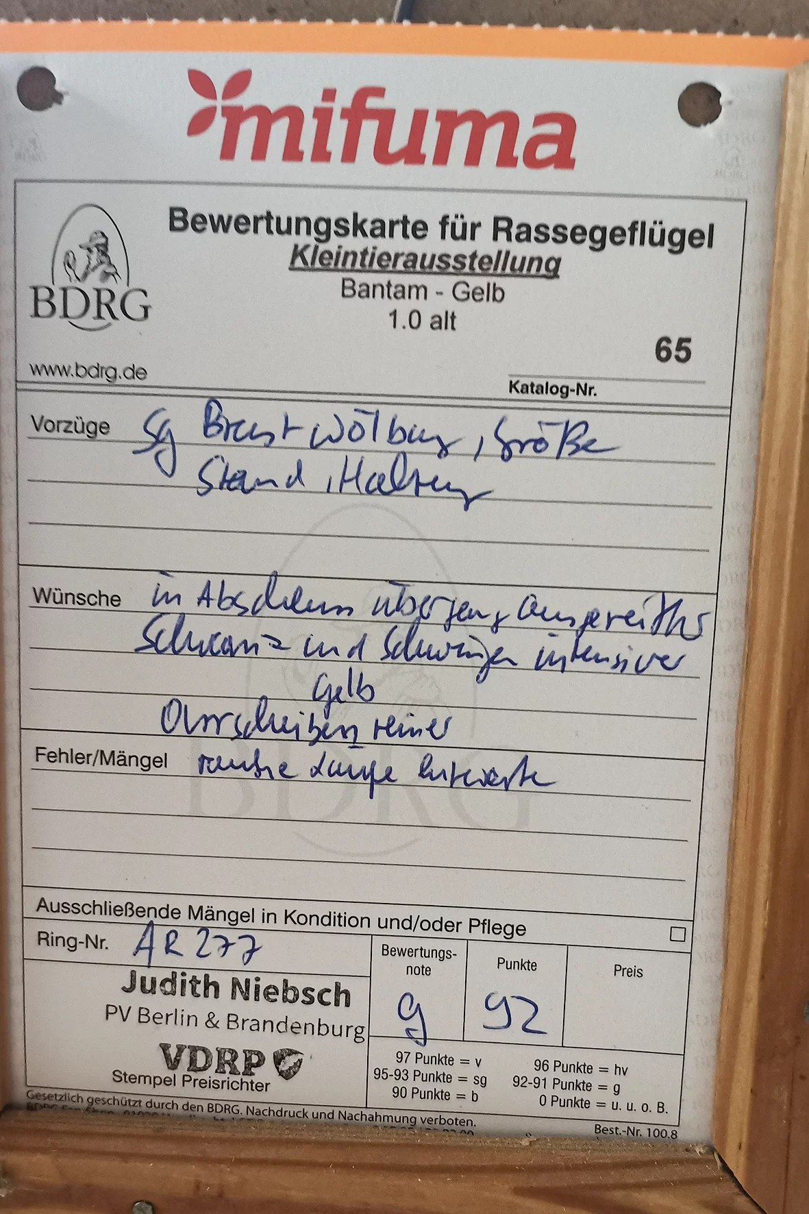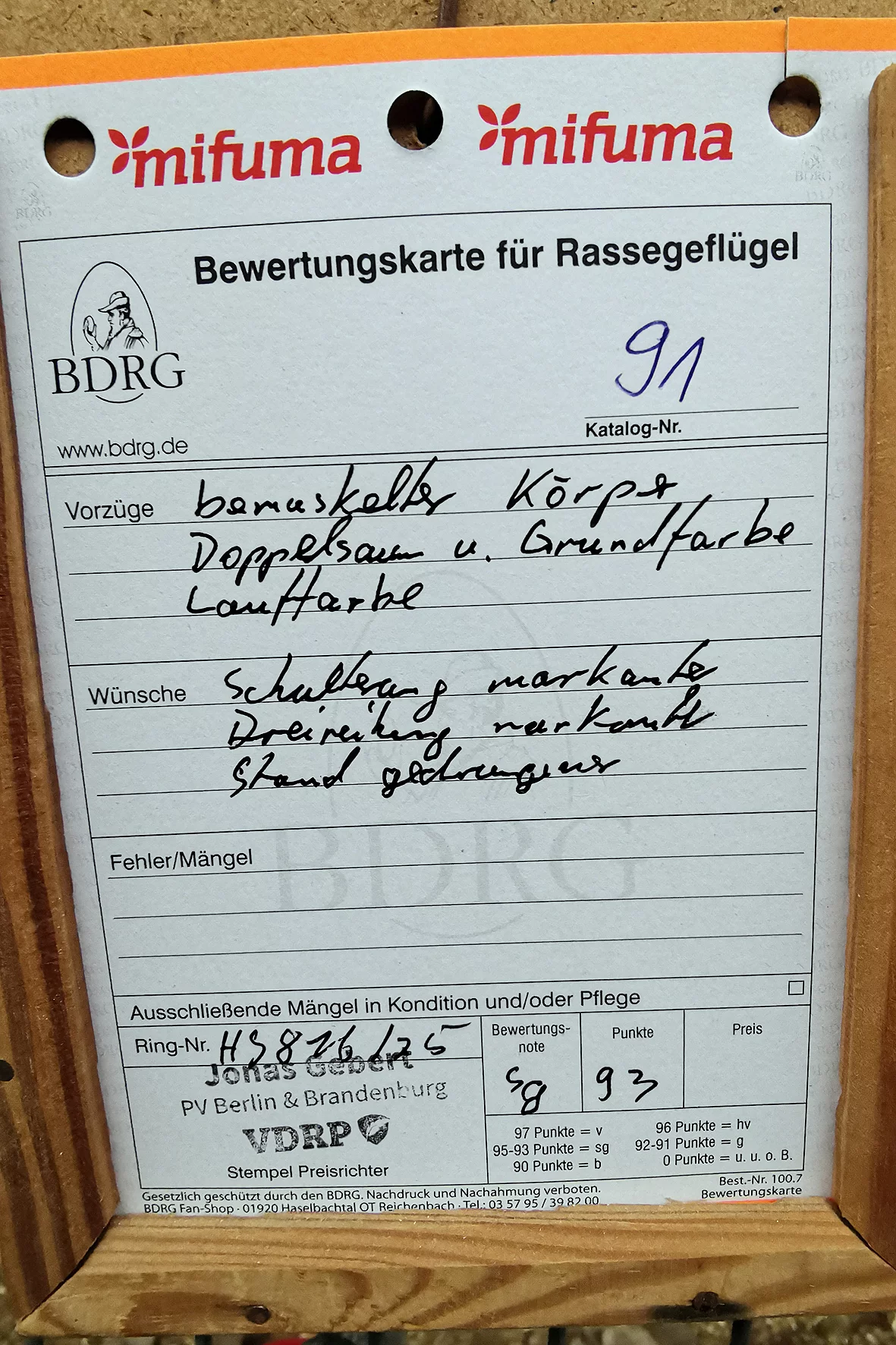 Umso auffälliger war es, dass die Bewertungen bei dieser Schau mehrfach zwei bis drei Punkte unter der vorherigen Bewertung lagen. Woran dies letztlich lag, lässt sich nur spekulieren. Ein entscheidender Faktor dürfte jedoch die Zeit gewesen sein, die gegen die Blüte der Tiere gearbeitet hat. Hinzu kommt, dass die Tiere bereits Mitte November mit dem Legen begonnen hatten.
